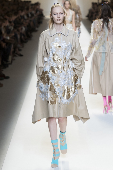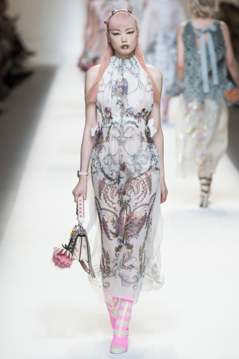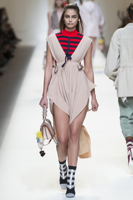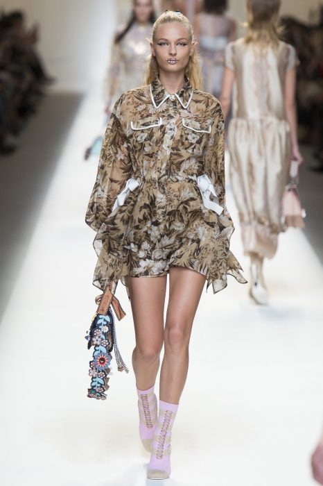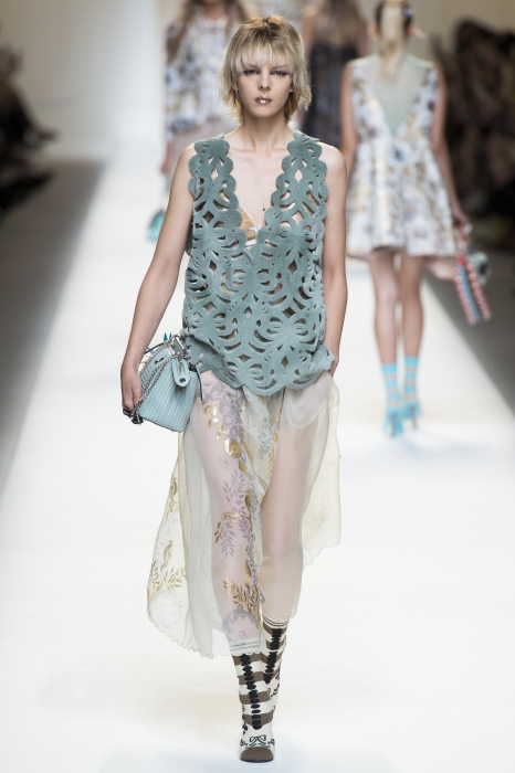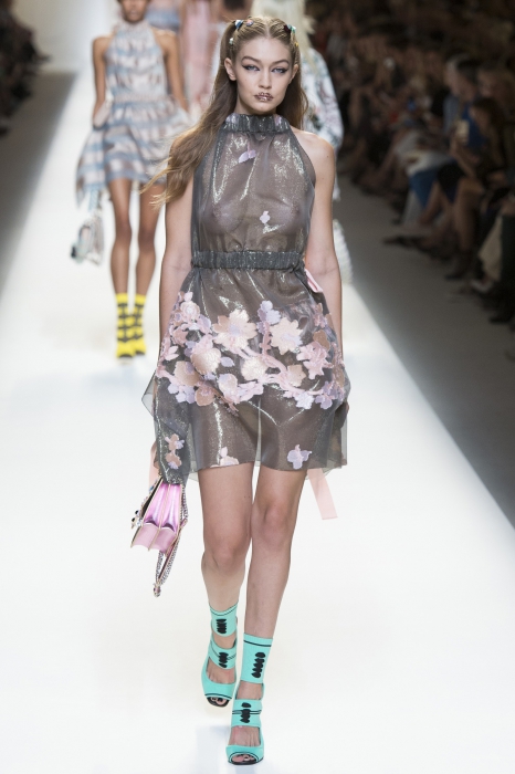 Показ Fendi открылся выходом Беллы Хадид в строгом мини-платье оттенка хаки. После палитра выходов начала смягчаться, а фактуры меняться на более нежные: шоу закончилось парчовым платьем с прозрачными вставками. Специалитетом марки всегда был мех (как говорит Лагерфельд, мех — это Fendi, а Fendi — это мех), но в весенне-летнем сезоне Fendi использует его по минимуму.