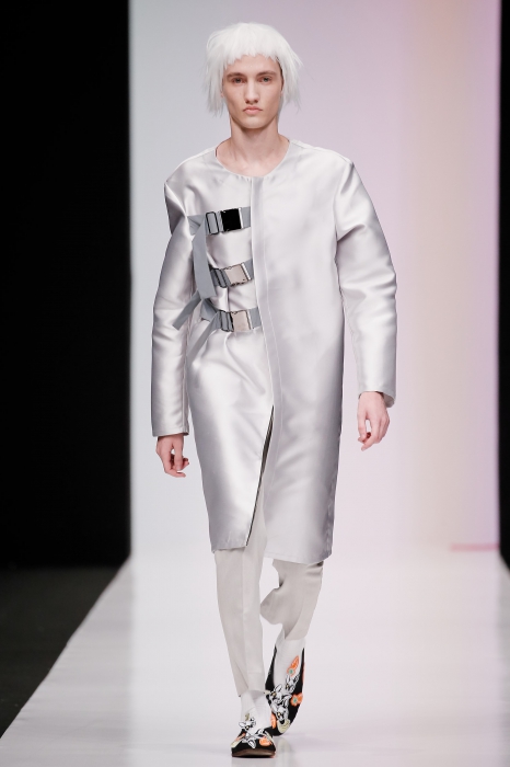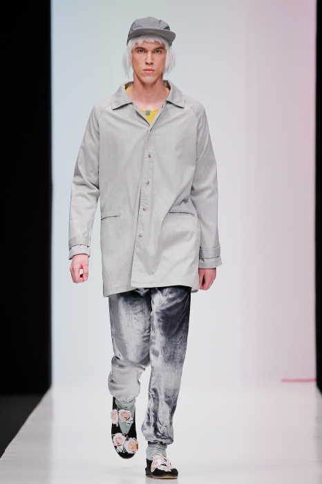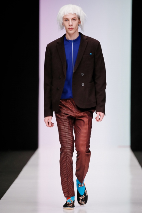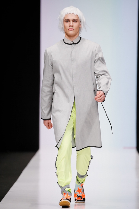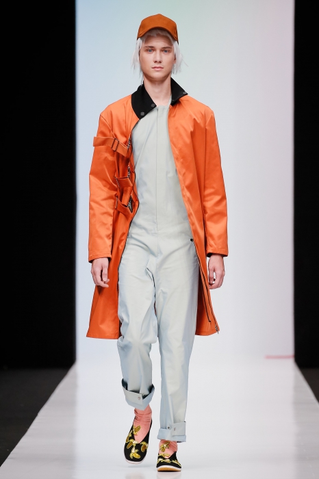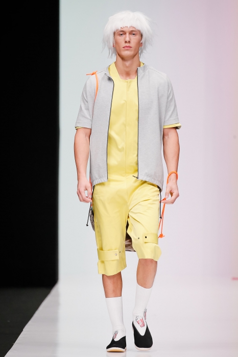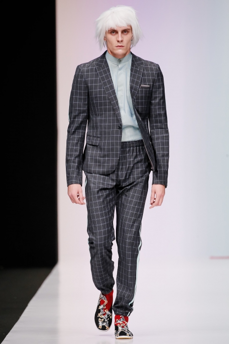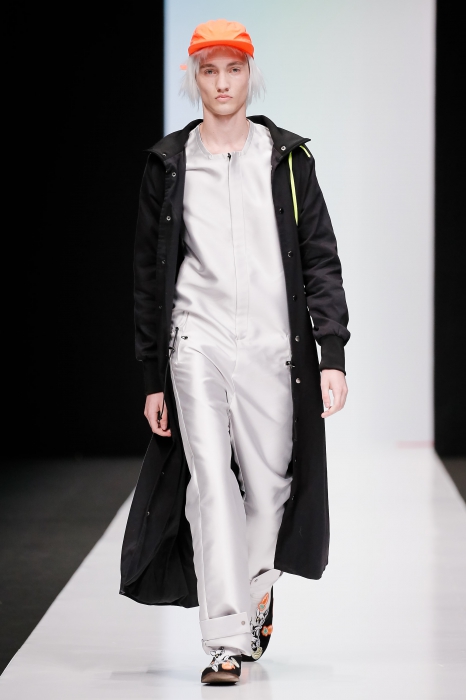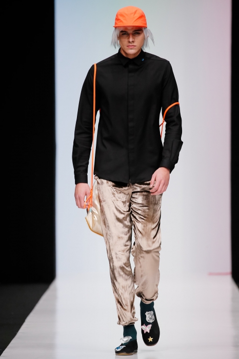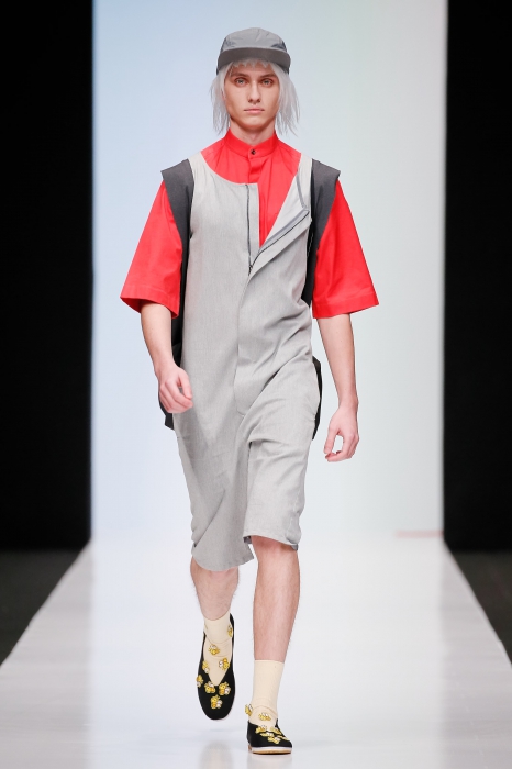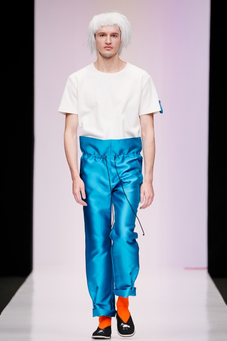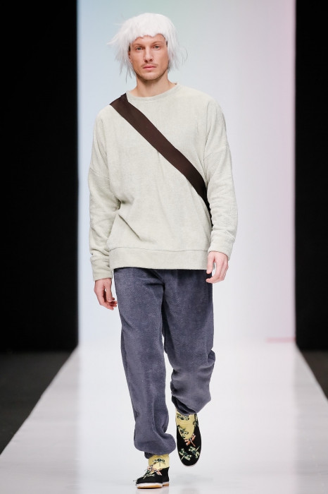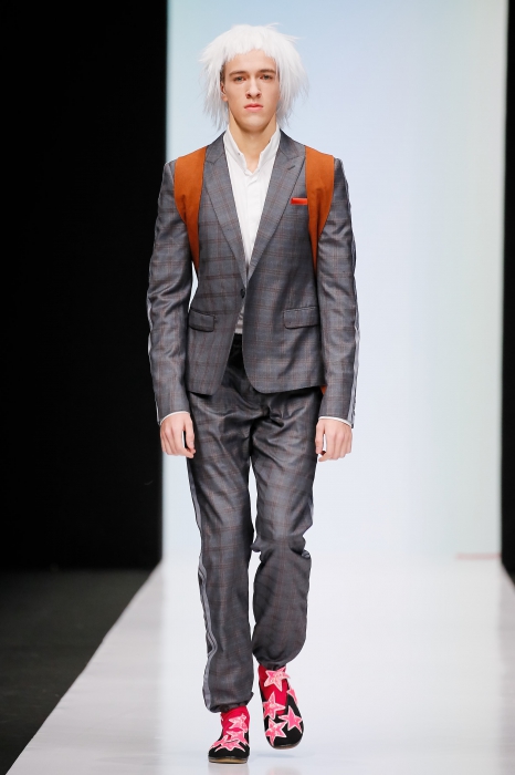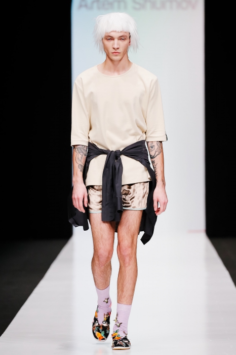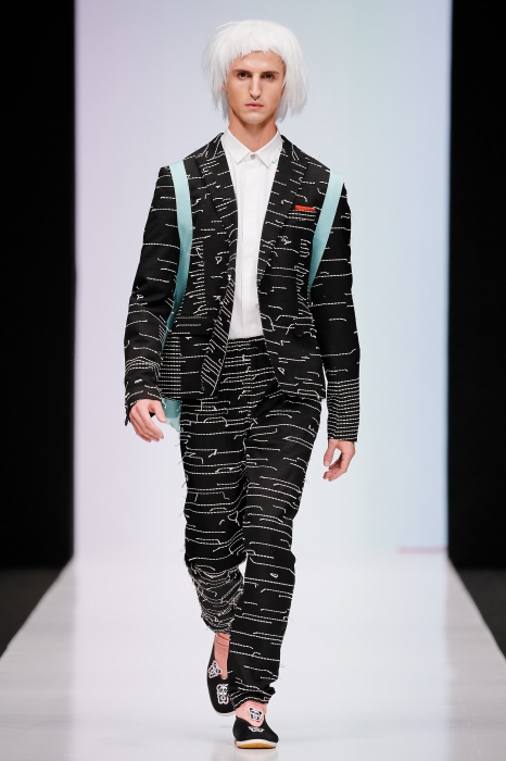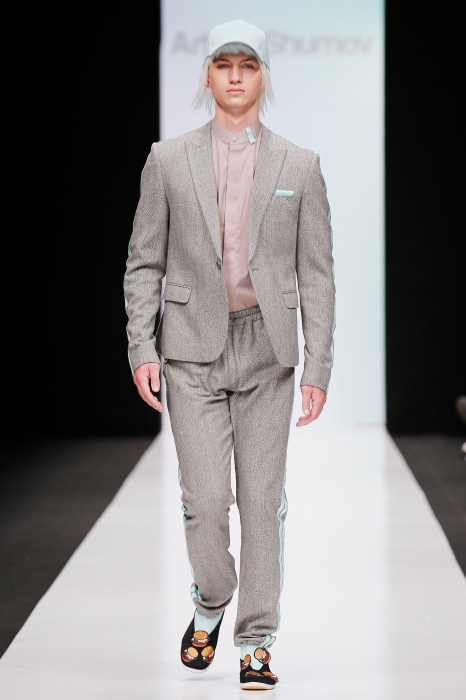 Неспроста на приглашении дизайнера изображена девочка со скакалкой: Шумов сделал ход конем разбавив минималистичную одежду спортивными элементами. Большинство моделей выходило в кепках и со спортивным мешком за плечами, а рукава двубортных пиджаков и штанины брюк и вовсе были покрыты крупной полоской.