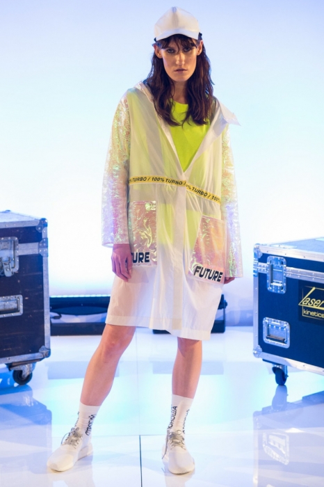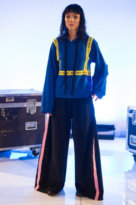 Соратница Андрея Бартенева и финалистка нашего конкурса «Новые имена в дизайне» Юлия Воробьева (Макарова) представила новую коллекцию на Mercedes-Benz Fashion Week в Москве. Презентация прошла в формате мини-рейва с участием хедлайнеров вечеринок «Скотобойня», да и сами вещи воплощали дух рейва. Клубная культура 1990-х хорошо считывается в буйстве цветов, смешении фактур, а также стилистически похожих надписях на карманах, линиях молнии, подолах платья и худи.