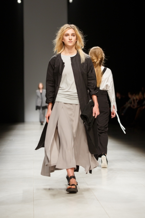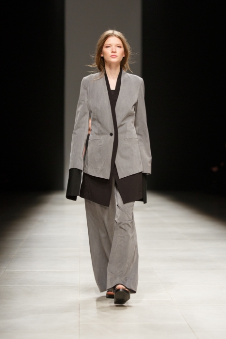 Цветовая палитра — традиционная для Яниса: черный, серый и белые, которые плавно перешли в пастель и закончились алым. Много oversize-платьев и жилетов, сорочек и свободных костюмов, которые органично уживались с остромодными нарядами на одно плечо и легкими шифоновыми юбками.
