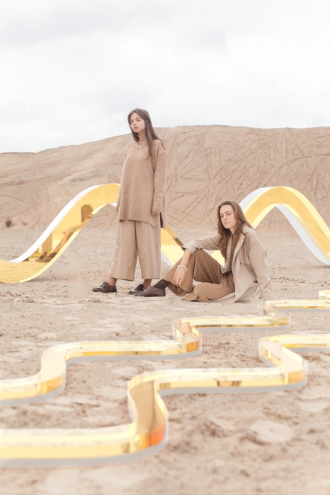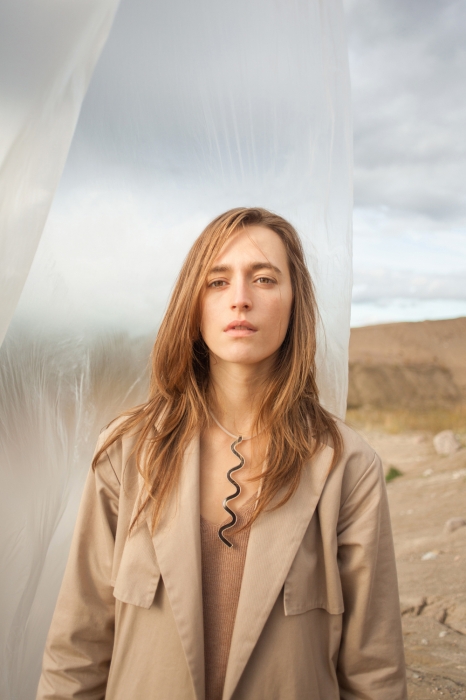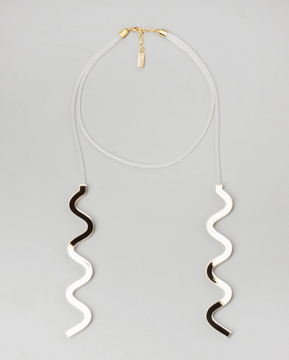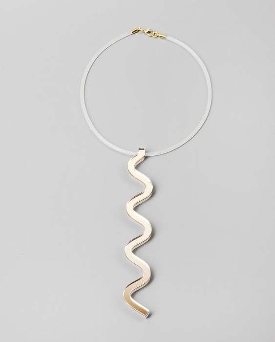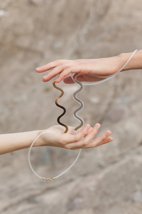 В коллекцию вошли три волнообразных колье из плексигласа, которые уже можно заказать в онлайн-магазине бренда (от 3000 до 4000 рублей). Колье соединяются на матовую полупрозрачную силиконовую нить, которая изменяется вместе с цветом одежды и становится практически невидимой.