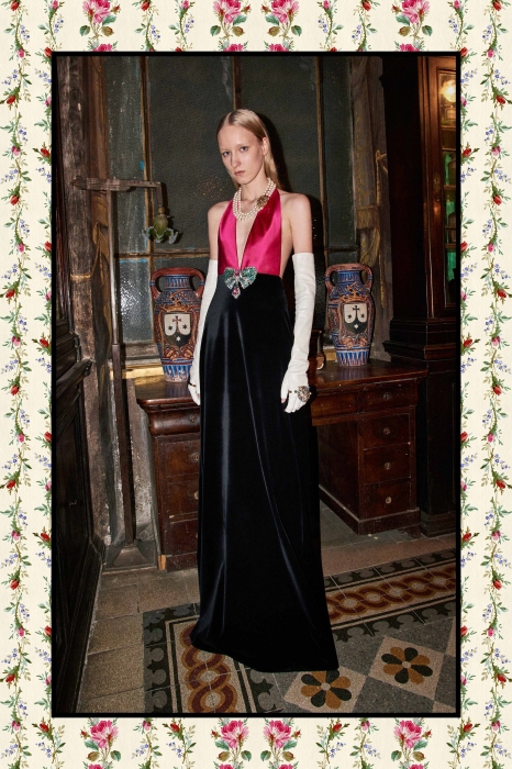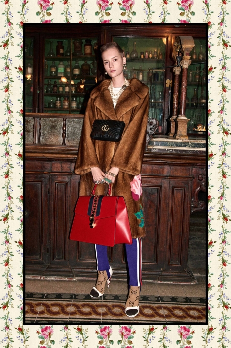 Оверстайлинг — отличительная черта коллекций Gucci. Если раздробить любой из луков pre-fall коллекции на части, то получится комплект простых вещей, которые легко представить в повседневности: меховое пальто, бомбер, бархатное платье, поясная сумка, цветные сапоги. Но Микеле не был бы собой без фирменного стайлинга: так к нарядам в духе Марии-Антуанетты он надевает легинсы с лампасами, спортивные худи украшает почти имперской вышивкой, а привычные платья-футляры из 1960-х под его присмотром больше похожи на вещи из будущего, если надеть их с красными колготками, тюрбаном и большими серьгами.