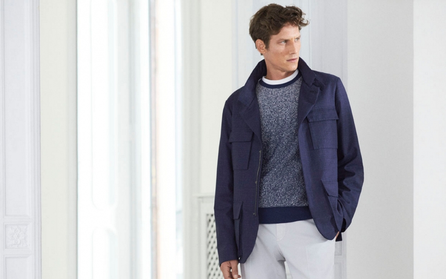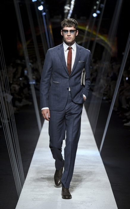 Традиционные предметы спортивной одежды, такие как парки и бомберы скроены из мягкой замши, опойковой кожи и кожи ягненка, а длинные плащи свободного кроя — из легких технических тканей XXI века, созданных для динамичного образа жизни в мегаполисе. Ощущение неструктурированной и свободной элегантности проникает и в аксессуары: образы дополняют небольшие сумки на талии вместо портфелей, шарфы и нагрудные платки вместо галстуков. Палитра коллекции колеблется от стального синего до жженой сиены и охры — вдохновением для дизайнеров стали итальянский горизонт и летнее небо.