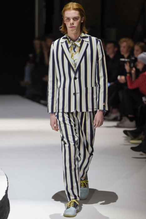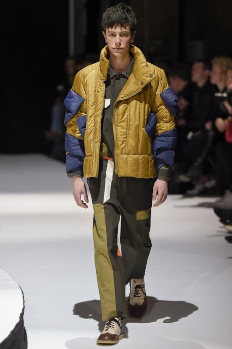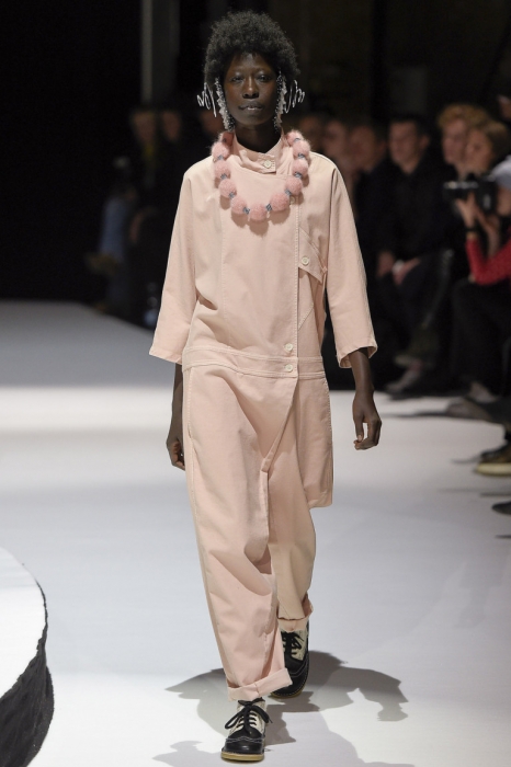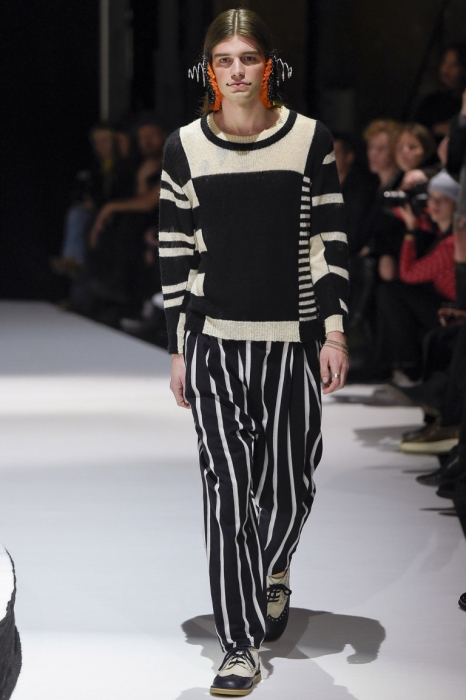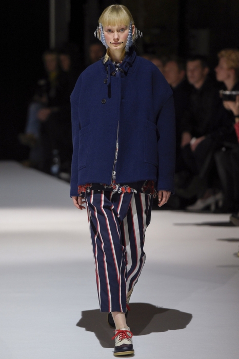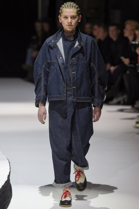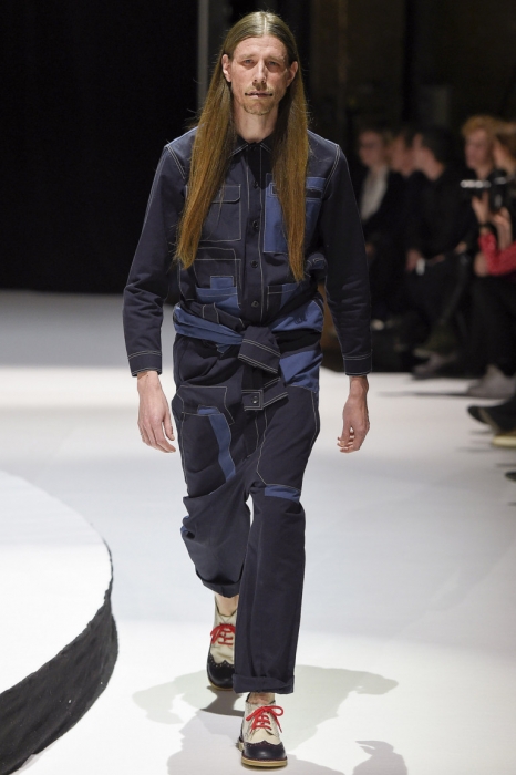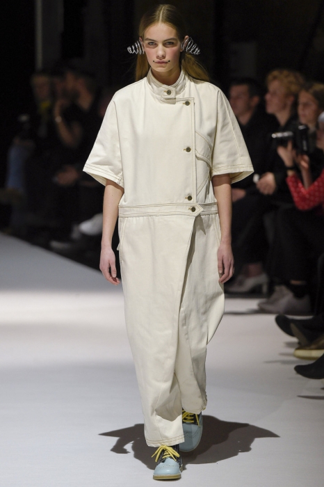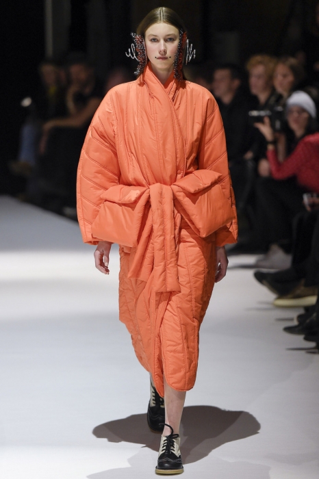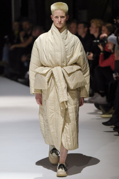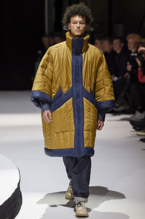 В коллекции мы увидели джинсовые и замшевые комплекты в расслабленном скандинавском стиле, костюмы в полоску и комбинезоны, как у рабочих. Любимая вещь Вибскова — пуховики: он завязывает их как халаты и снабжает объемными карманами, которые заменят сумку.