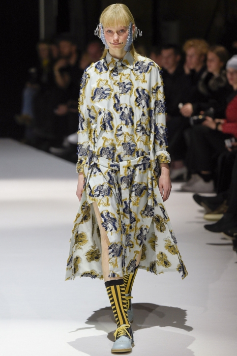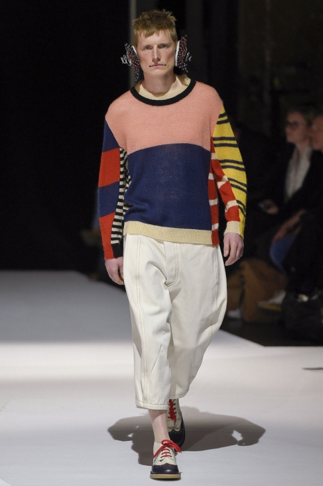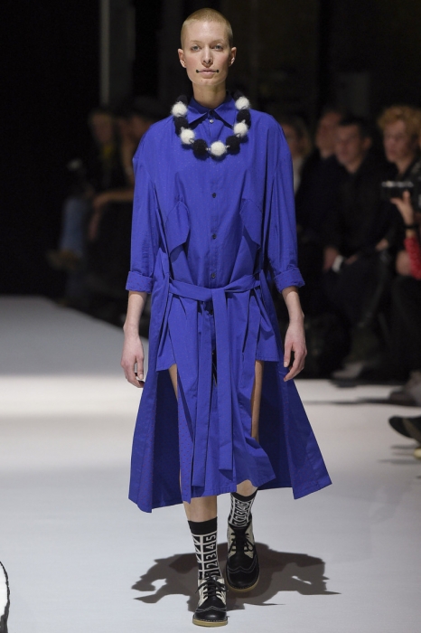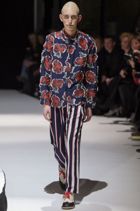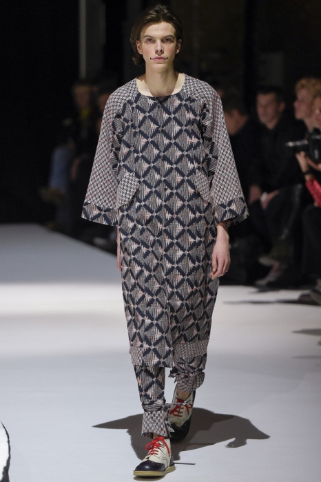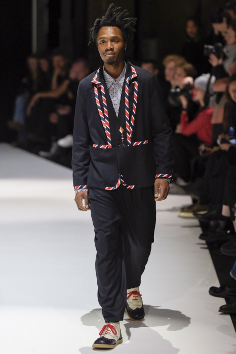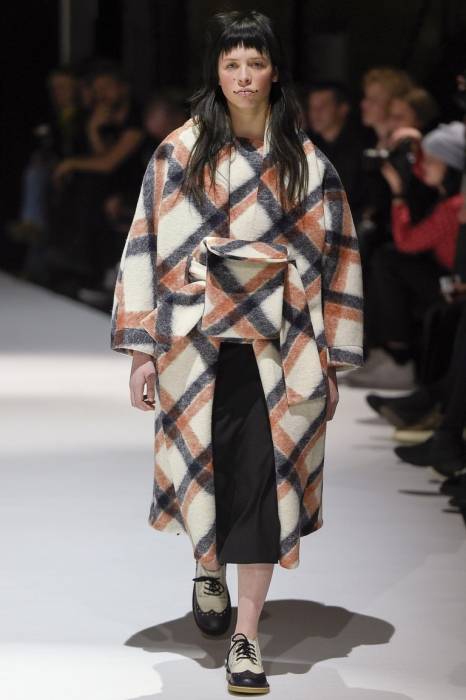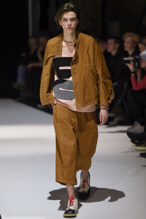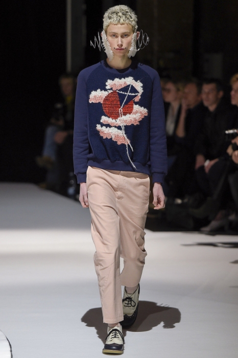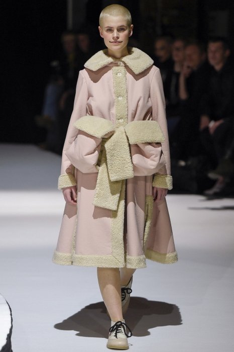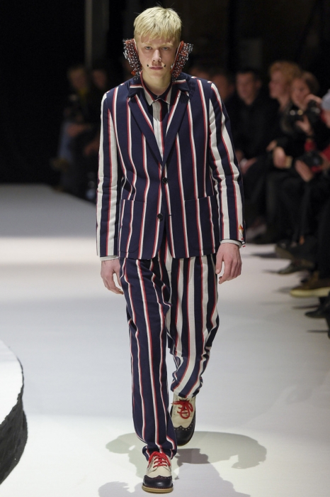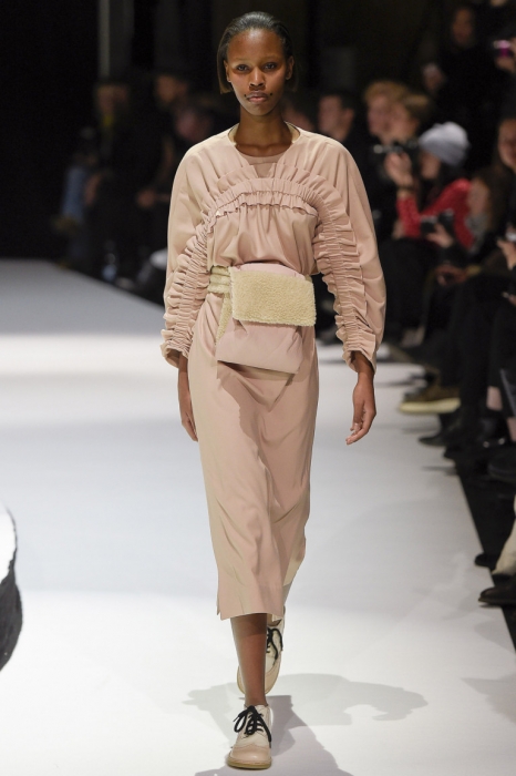 В коллекции мы увидели джинсовые и замшевые комплекты в расслабленном скандинавском стиле, костюмы в полоску и комбинезоны, как у рабочих. Любимая вещь Вибскова — пуховики: он завязывает их как халаты и снабжает объемными карманами, которые заменят сумку.