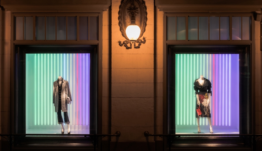 Накануне нового сезона ДЛТ представил новые витрины: окна по периметру универмага украсили в минималистичном стиле. Для декораций использовали 355 неоновых трубок. Больше двадцати манекенов представляют свежие коллекции, которые уже продаются в ДЛТ: Saint Laurent, Gucci, No. 21, Marni, Dolce & Gabbana, Balenciaga, Celine, Acne Studios, Calvin Klein Collection и другие.
