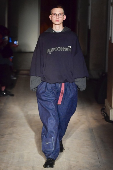В Санкт-Петербурге прошел показ новой весенне-летней коллекции Гоши Рубчинского. Как и ожидалось, в ней было немало отсылок к грядущему Чемпионату мира по футболу: на подиум вышли парни в гетрах, шелковых спортивных шортах, розовых олимпийках и джемперах. Второй тематикой коллекции стали уже не раз воспетые Гошей рейвы, а именно – петербургский «Восточный удар». По версии дизайнера, дресс-код такого мероприятия– ассиметричные жилеты в стиле милитари, рубашки со знаком биологической опасности и куртки с эффектом tie-die, апеллирующие к эпохе и философии хиппи.