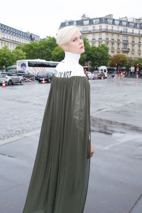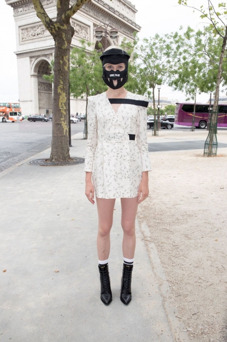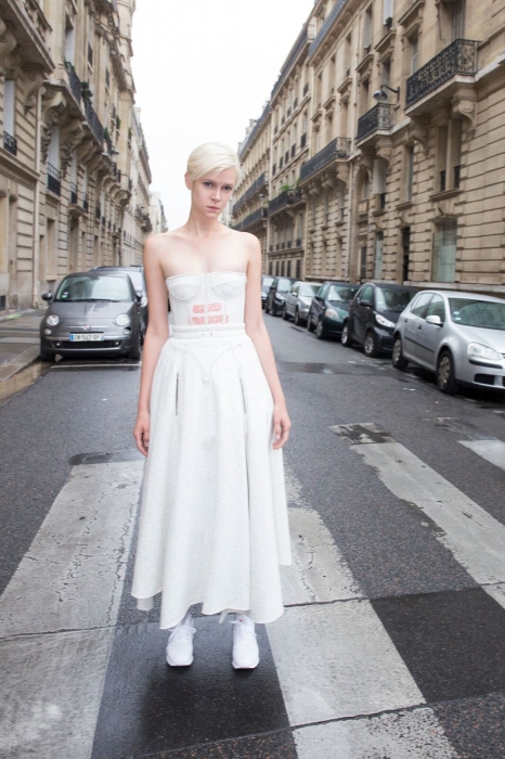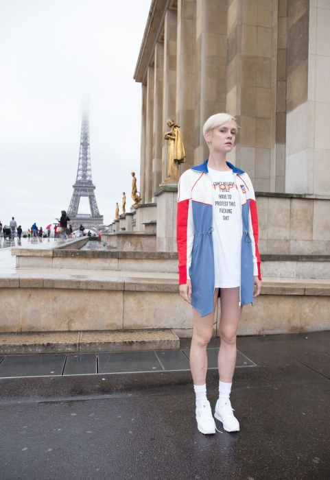В процессе создания коллекции дизайнер вдохновлялся японским sci-fi, фильмом «Равные» с Кристен Стюарт, сериалом «Утэна» и музыкой SONH и The Acid. Хотя мы нашли в лукбуке и другие отсылки: майки с текстом «Can’t believe I still have to protect this fucking shit» («Не могу поверить, что я еще должна защищать это дерьмо») сделаны тем же шрифтом, что и «феминистские» футболки Christian Dior, которые стали фэшн-символом борьбы за эмансипацию женщин. Оммаж работам Марии Грации Кьюри также прослеживается в красных юбках-пачках, полупрозрачных плиссированных мантиях и платьях-бюстье с подчеркнутой грудью.