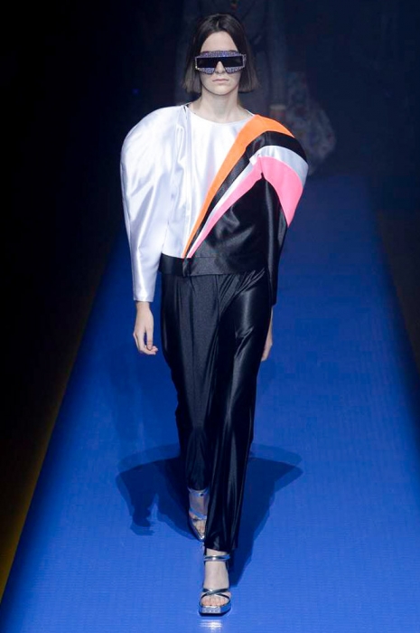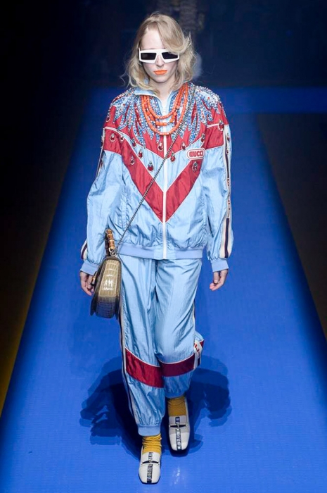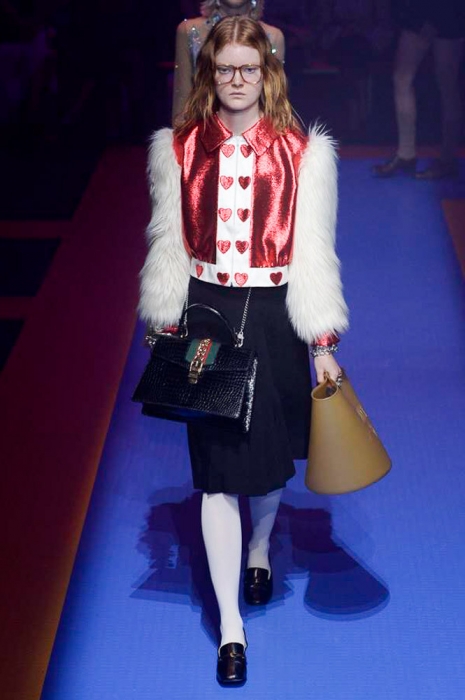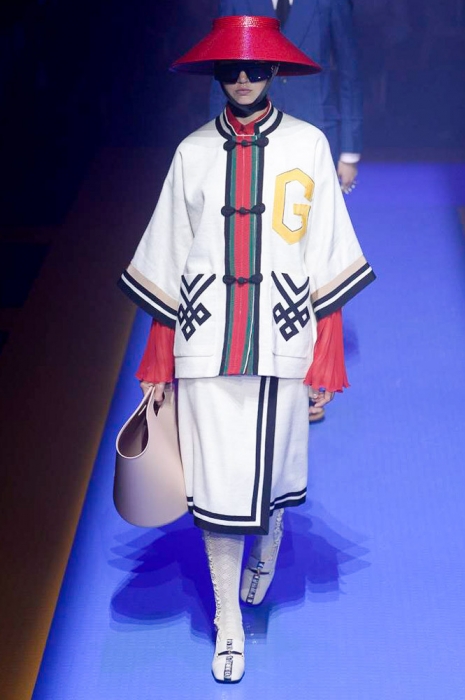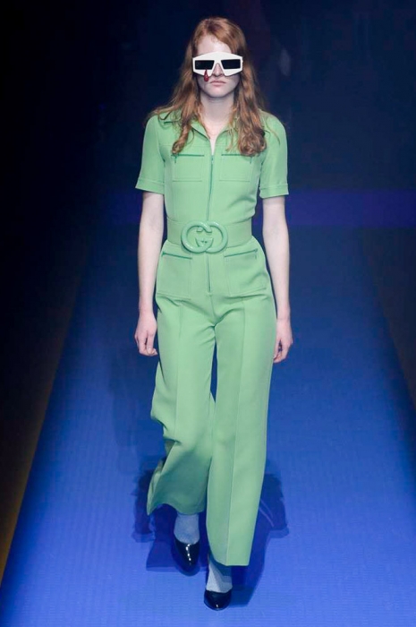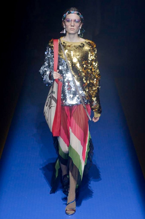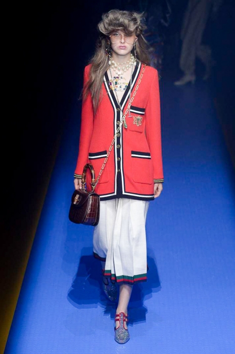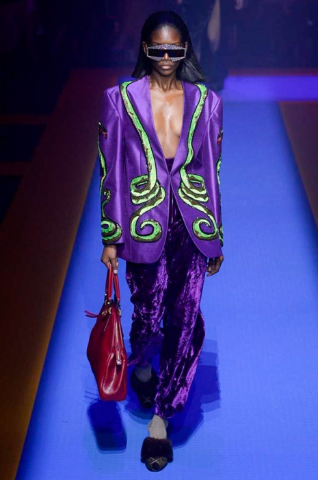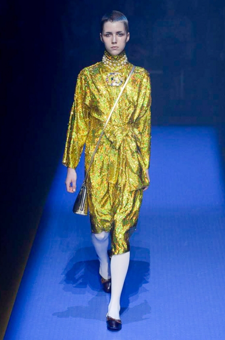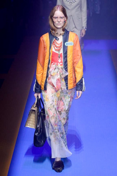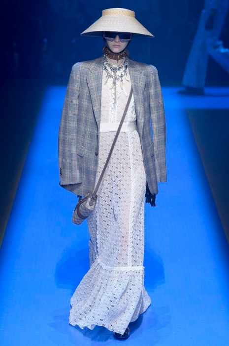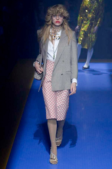 Неделя моды в Милане стартовала с показа весенне-летней коллекции Gucci, которую ежесезонно ждут все, кто любит Алессандро Микеле, «бабушкины» луки и игру в «угадай культурный код». На этот раз мы нашли среди них не ренессансные платья и терновые венки, а Голливуд 70-х (пиджак Элтона Джона, костюм Элвиса Пресли, широкоплечие жакеты и вырви-глаз платья), осовремененный японский костюм (кимоно, каса и жесткие сумки), фильм «Служебный роман» (офисные юбки ниже колен в сочетании с блестящими колготками), а также цирк, мотоспорт и очки виртуальной реальности.