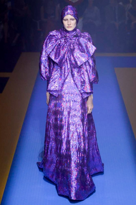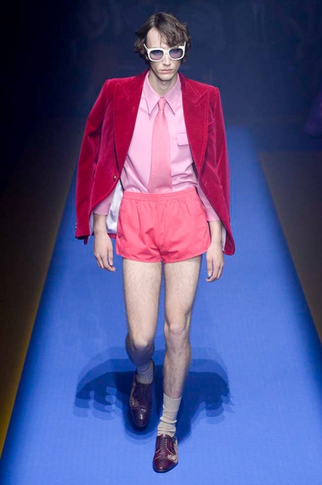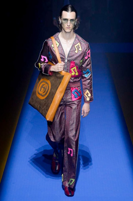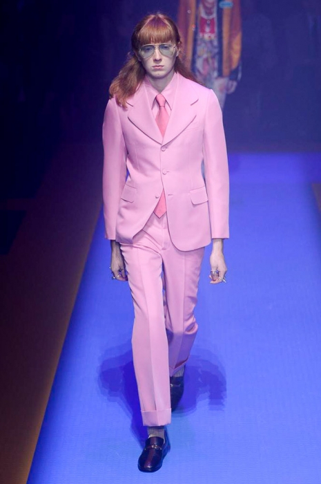 Девушек в тотал-пинк-луках и красочных шароварах сменяли парни, похожие на Джареда Лето — самого большого поклонника Gucci и амбссадора парфюма Guilty, — с прилизанными волосами, очками-авиаторами и множеством браслетов, надетых на обе руки. Вангуем, скоро все мужские луки с показа переберутся в его гардероб, а фестивальные наряды в пол а-ля конфетные обертки — на красные дорожки «Грэмми» и «Золотого глобуса» и «Оскара».