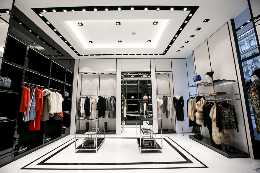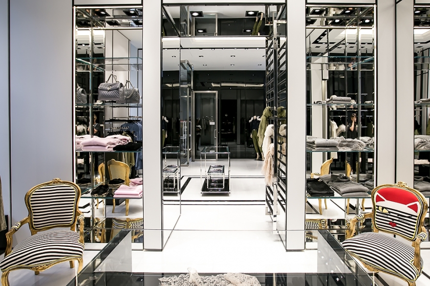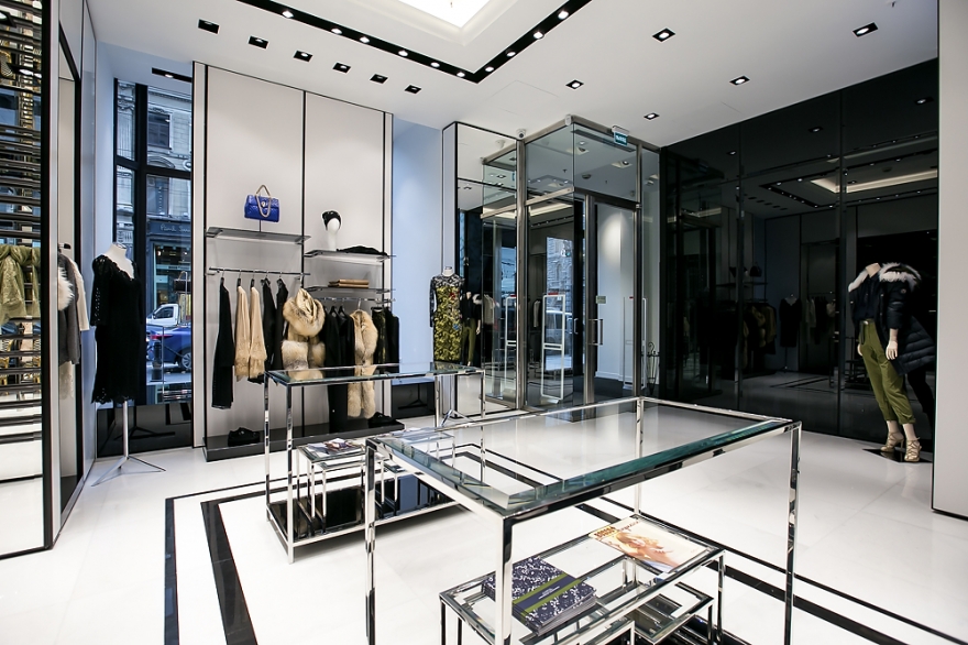 В интерьере черно-белого салона итальянского бренда нет никаких постеров, лайтбоксов и световых конструкций. Его создатели заменили привычный декор подиумами и белыми задниками витрин, а дизайн сделали строгим и лаконичным. Благодаря такому минимализму, обилию зеркал и стеклянных панелей вся коллекция Ermanno Scervino просматривается легко и во всех деталях.
