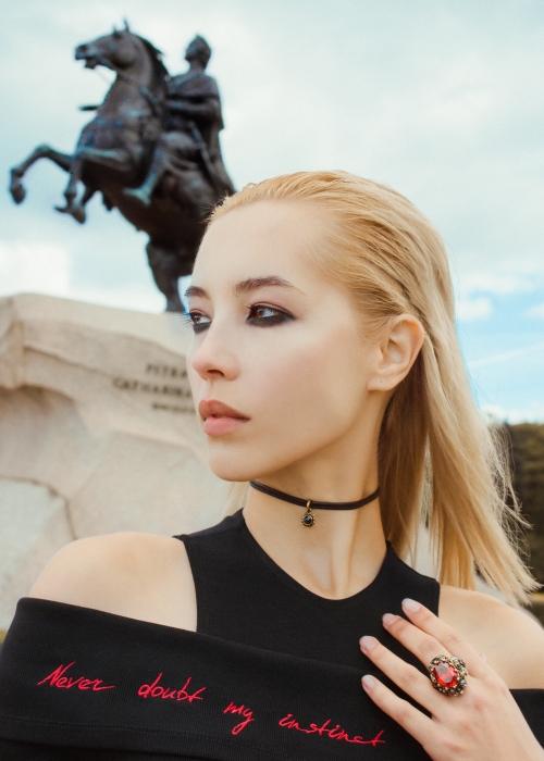 О мудборде коллекции говорят принты. «Never doubt my instinct» — девушка доверяет своему внутреннему инстинкту и ощущениям. Как когда-то Петр I построил город на болоте, сделав невозможное возможным, полагаясь на свой инстинкт, так и в наши дни, каждая девушка преодолевает трудности, полагаясь на свой. «Being Xtreme» — состояние выхода за рамки комфорта и поиска в себе сверхспособностей. «No matter what» — история любви, несмотря ни на что. Конечно, сильной девушке иногда хочется побыть слабой, поэтому бежевое боди с кнопками на спине, так и норовит быть расстегнутыми сильными мужскими руками. Наша героиня преодолевает себя, идет к своей цели, рискует и пьет шампанское!».
