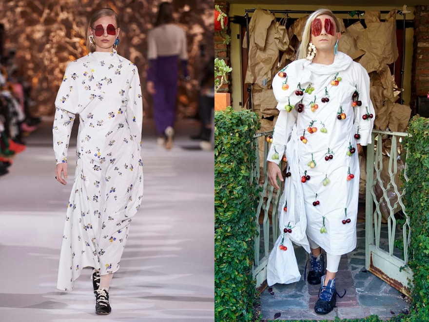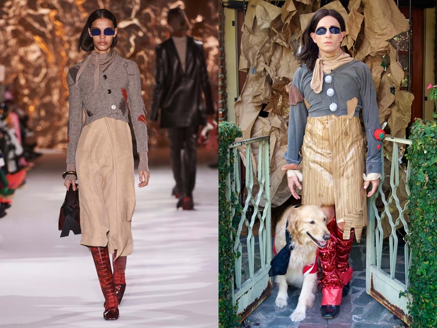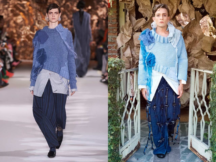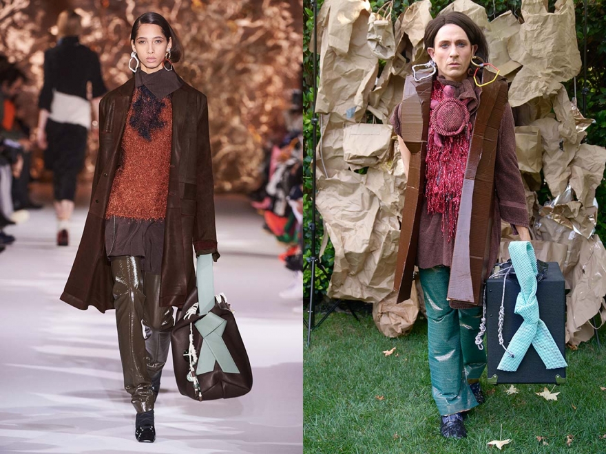 Один из последних осенне-зимних привозов ДЛТ (зимой стартуют поступления коллекций на весну и на лето) связан с брендом Acne Studios, известным по фэшн-съемке с 78-летней Верушкой и рваной деконструированной одежде. Удлиненные кардиганы как из бабушкиного комода (или фильмов Хичкока), вязаные свитеры с дырками, лакированные брюки и жакеты «наоборот» спародировал американский комик Том Ленк. В двойном лукбуке, опубликованном на сайте Acne Studios, он заменил вещи с подиума на пояса из одноразовых бритв, очки из бекона, юбки из двустороннего скотча и кардиган из картона. Получилось (почти) похоже.