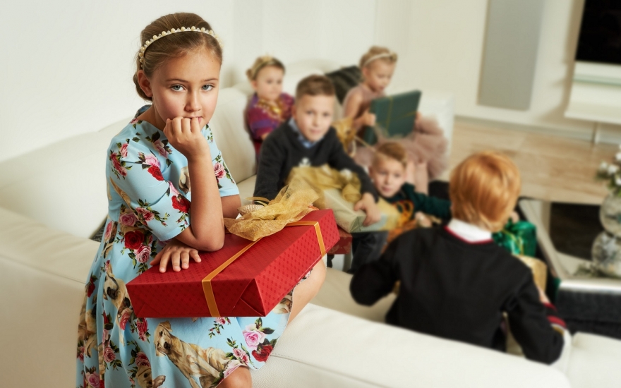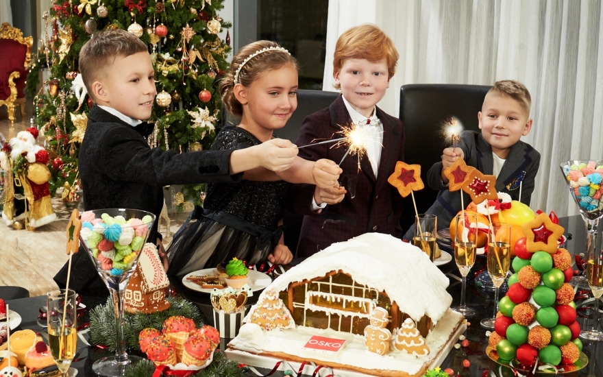 На празднике дети примерили новогодние наряды: мальчики — клетчатые и твидовые костюмы от Dolce&Gabbana и Gucci, девочки — сверкающие платья от David Charles, Lesy и Aletta. Для создания тотал-луков стилисты подобрали ботинки, бабочки, балетки с люрексом и ободки с перьями.