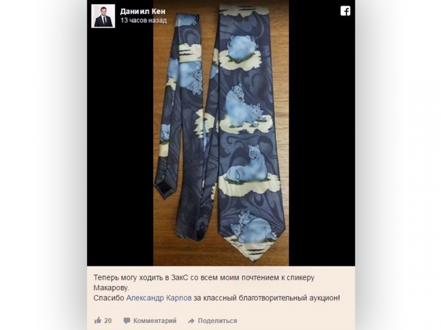 За пару дней до этого события глава Центра экспертиз ЭКОМ Александр Карпов устроил на своей странице в Facebook весьма необычный аукцион. Лотом стал галстук «для прохода в Законодательное собрание». Предмет гардероба был маркирован пометкой 18+, так как на нем были изображены свиньи в весьма легкомысленных видах. Впрочем, к рисунку на галстуках, кажется пока действительно никаких отдельных требований не предъявлялось. Стартовая цена лота составляла 500 рублей, но был продан он в итоге в 7 раз дороже депутату муниципального совета Даниилу Кену.