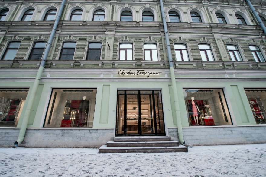 В историческом шопинг-центре Петербурга, на Невском проспекте, 150, открылся новый бутик марки Salvatore Ferragamo, которая обувала Энди Уорхола, Мэрилин Монро, Грету Гарбо и Одри Хепберн. Сегодня к осовремененным ботинкам, туфлям и сабо из архивов Феррагамо (каждая модель выпущена лимитированной серией и имеет уникальный номер) добавились мужские и женские костюмы, куртки, платья, а также аксессуары из шелка и кожи, парфюмерия и очки. Все коллекции расположились на 170 м2 с просторным залом и удобными примерочными. Мраморные полы, мебель из полированного ореха, детали из стали и латуни, бархатные диваны розового и горчичного цветов — все как в главном флорентийском бутике «звездного» бренда.