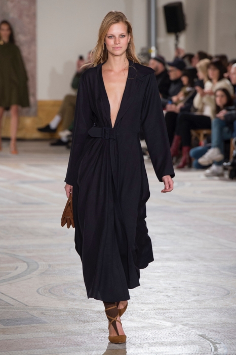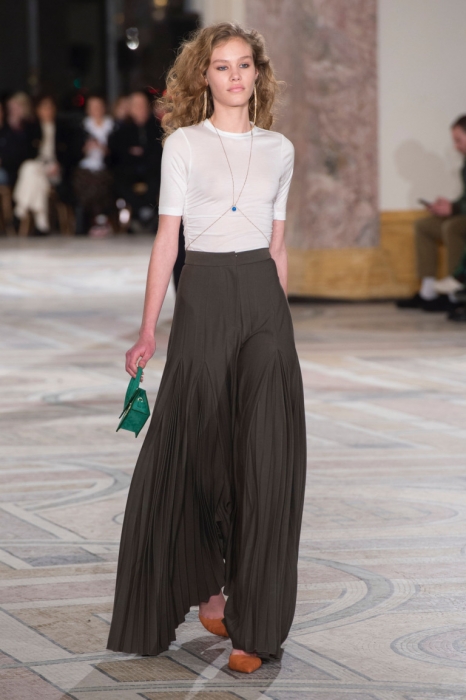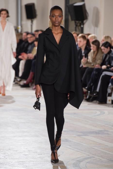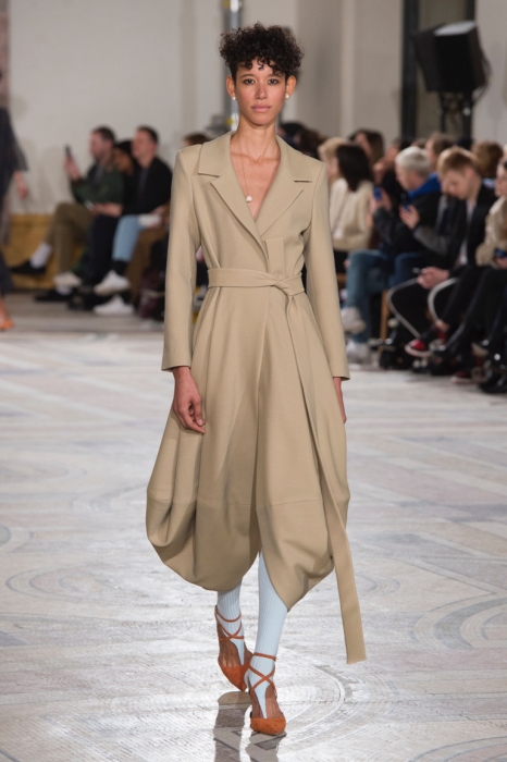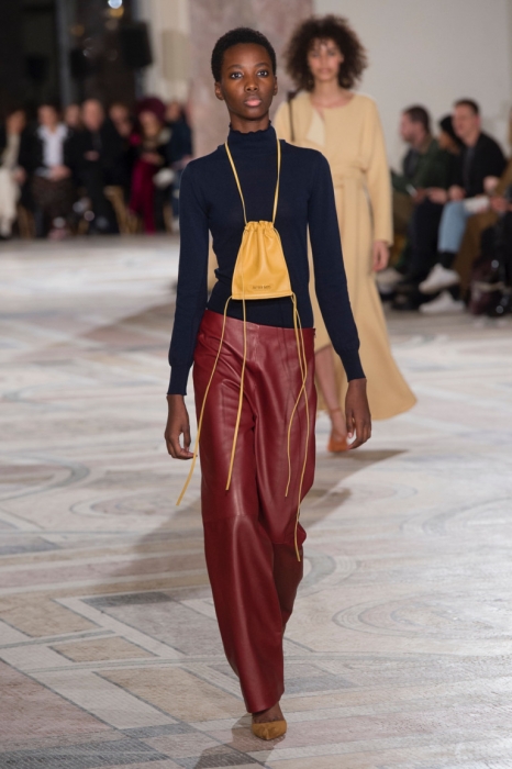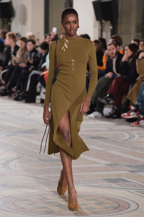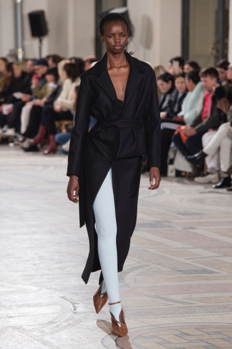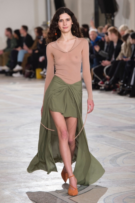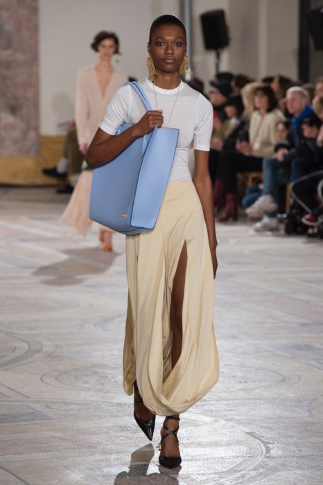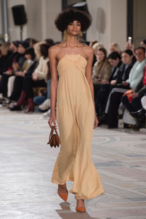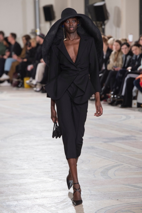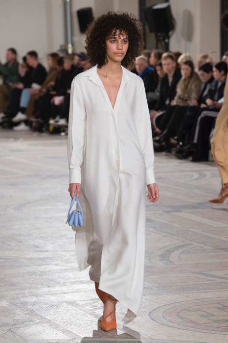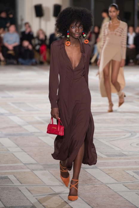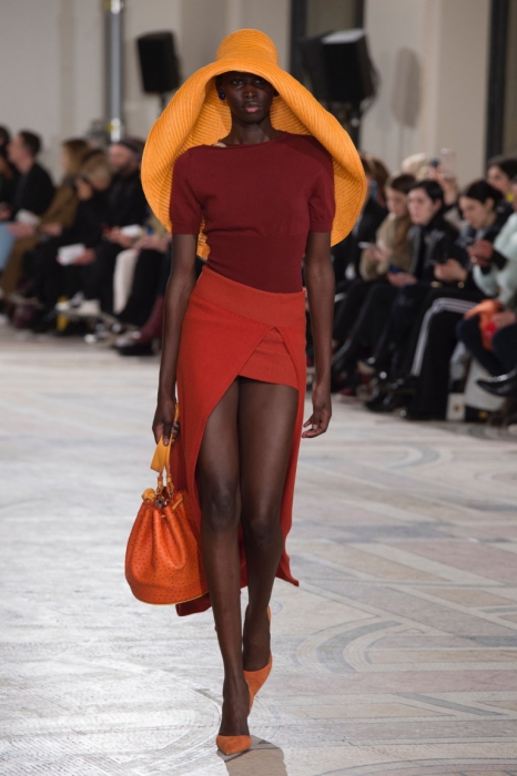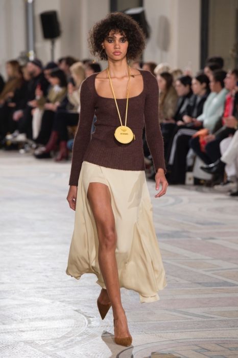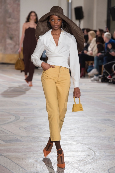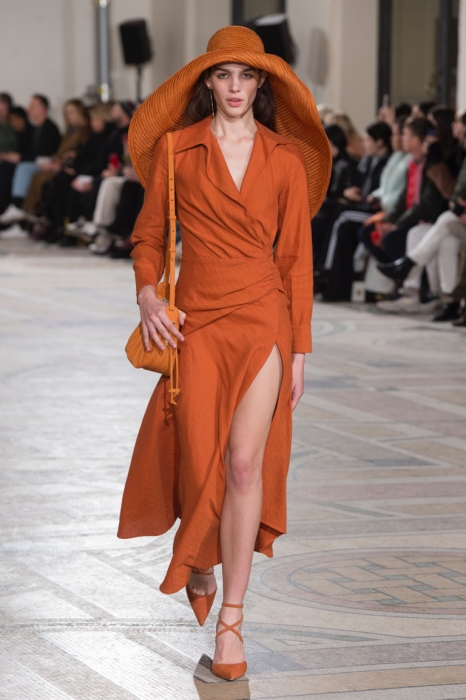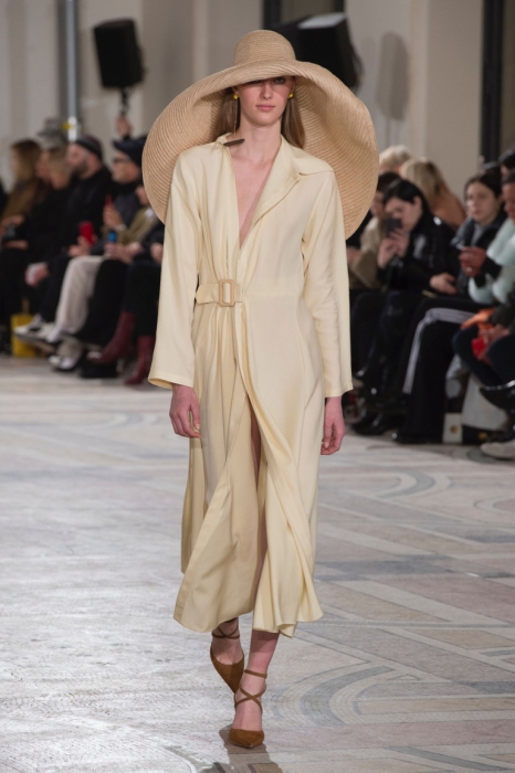 Худи с надписью было скорее исключением, нежели тенденцией. Jacquemus по-прежнему делает однотонные платья на любой случай жизни, нюдовые тренчи-коконы, рубашки с объемными плечами, клатчи-медальоны, поясные корсеты, крошечные сумки и гигантские шляпы, которые стопроцентно спасут от солнца. Гости первого ряда и онлайн-зрители шоу даже забыли, что это осенне-зимняя коллекция марки, а за окном маячат 20 градусов мороза.