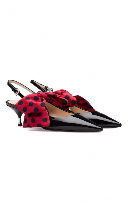 В туфлях Prada идеально все: лаковые носы, барочные банты и самый актуальный каблук сезона, именуемый kitten heel. (Prada)