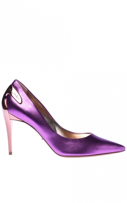 Контрастный перламутровый каблук сияющих лиловых лодочек Baldinini изогнут по всем правилам ар-деко. Фут-фетишисты будут в восторге! (Baldinini)