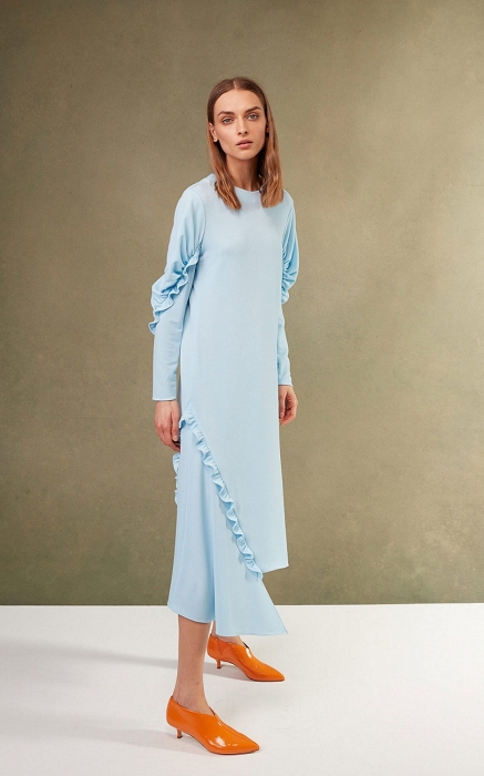 Коллекция американской марки Tibi нежна как ночь — не только из-за роскошных оттенков пудрово-розового и небесно-голубого, но и из-за ультраромантичных элементов: воланов, рюшей и тонких завязок.