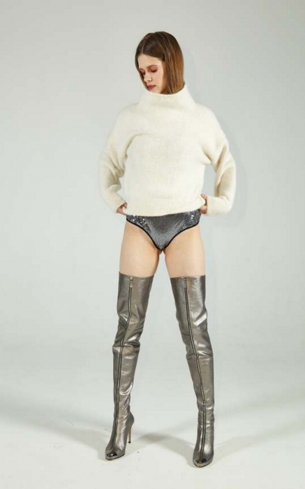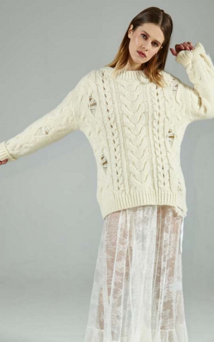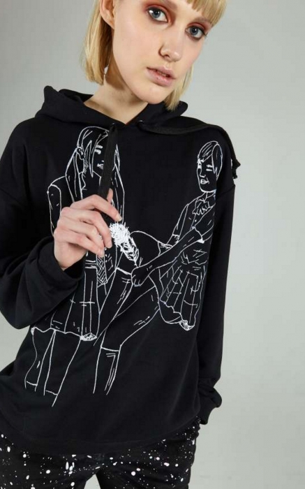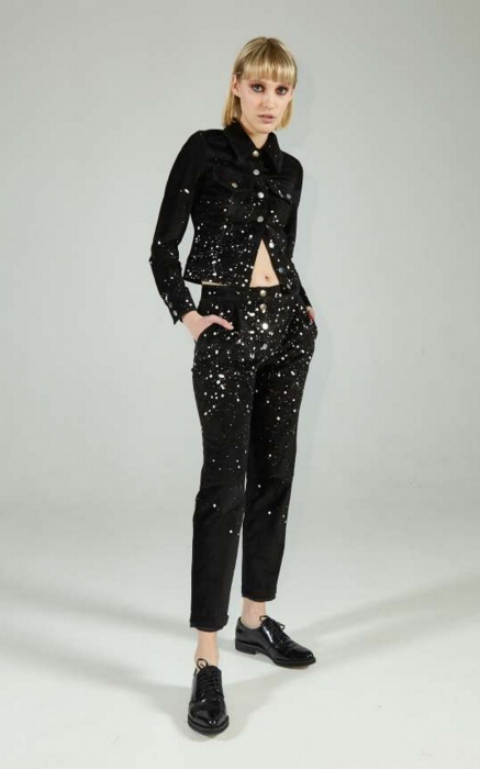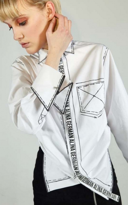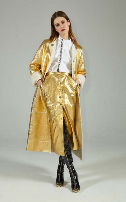 Все пати-образы (да, коллекции Alina German носят на главные вечеринки города) выполнены с поправкой на погодные катаклизмы. Легкое платье дизайнер комбинирует с вязаным свитером, брендированную рубашку — с утепленной юбкой на кнопках, боди из металлизированной ткани — с шерстяным джемпером, а брюки, нарочно забрызганные краской, — с разрисованной мелом толстовкой.