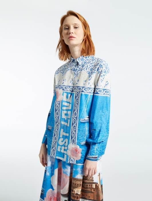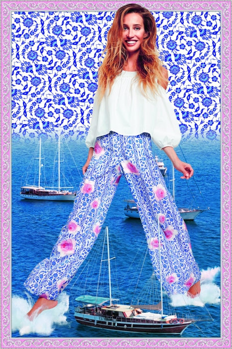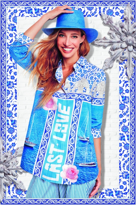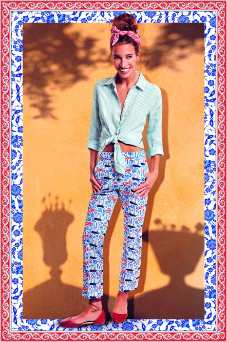 Блуза из хлопкового поплина декорирована и мозаичными узорами, принтами парусников и пионов. На объемной юбке с высокой талией в стиле 1950-х годов изображены городские и морские пейзажи. Флористический орнамент украшает широкие брюки с высокой талией и платье-рубашку. Ярко-красные буквы слова Love можно найти на платье-футболке, расклешенных брюках капри, платье-рубашке и юбке. Из аксессуаров в коллекцию вошли шелковые шарфы и сумки Pasticcino.