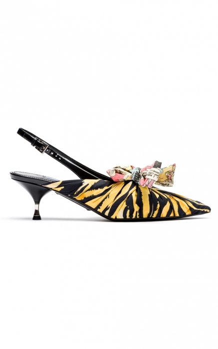 Мюли Prada, как обычно, не то, чем кажутся. Несмотря на кокетливый kitten heel, нос туфли оборачивается хищным тигром, а на банте оказывается принт из феминистичного комикса американки Трины Роббинс, одной из восьми художниц, приглашенных для работы над летней коллекцией. Так адепт концепции арт плюс фэшн Миучча Прада превращает вещи в арт-объекты. Срочно в коллекцию! (Prada)