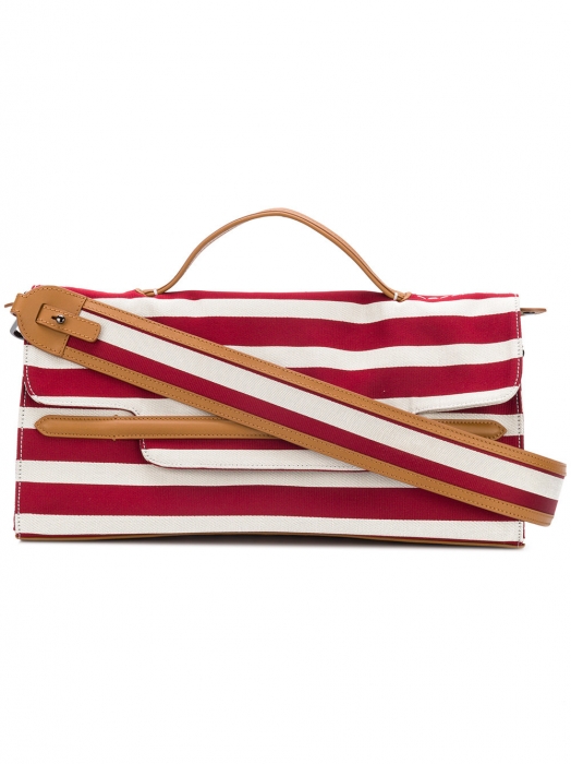 Дизайнер Франко Дзанеллато решил, что сезон должен быть предельно оптимистичным, и выпустил культовую модель сумки Nina в мягкой парусине в яркую широкую полоску, напоминающую зонтики от солнца на пляжах Позитано. Носить такую показано даже вдали от курортов — с белыми костюмами или голубыми джинсами. («Кашемир и Шелк»)