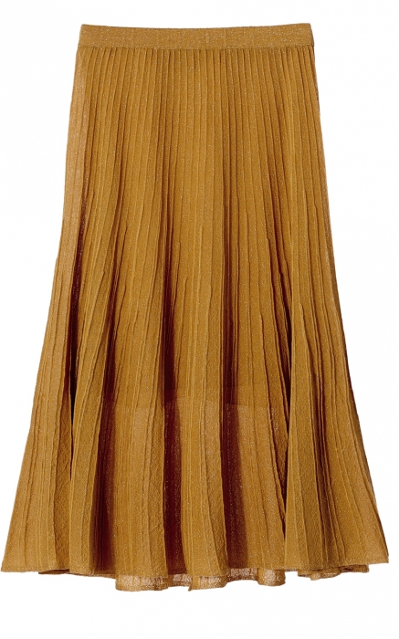 Плиссированную горчичную юбку Falconeri из тонкого кашемира будем носить с босоножками на высоком каблуке и золотыми носками из Calzedonia. Верх — тонкий шерстяной джемпер с воротом, разумеется. (ТРЦ «Галерея»)