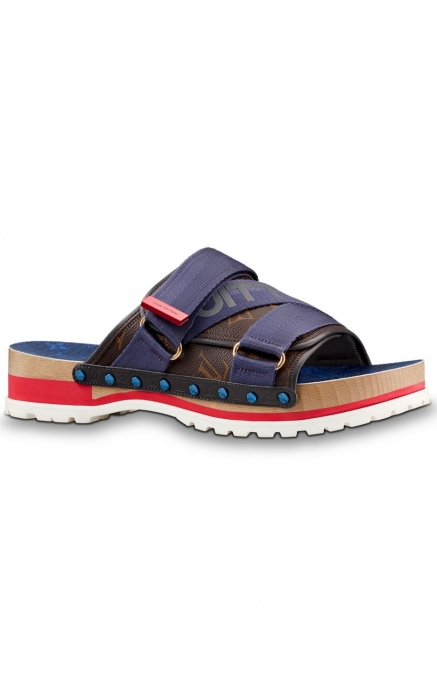 Ким Джонс из Louis Vuitton понял тренд на затейливую обувь так: мюли Honolulu с верхом из кожи Monogram он украсил лентой на липучке со светоотражающим логотипом и установил конструкцию на подошву из дерева, прошив ее для надежности бирюзовыми металлическими заклепками. (Louis Vuitton)