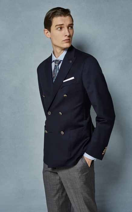 Мастера Henderson разработали коллекцию торжественных костюмов — и темно-синий двубортный блейзер из тонкой шерсти с лацканами и золотыми пуговицами просто безупречен. Для усиления эффекта рекомендуем услугу Su Misura — во флагманском салоне портной сошьет его по вашим меркам. (ТРЦ «Галерея»)
