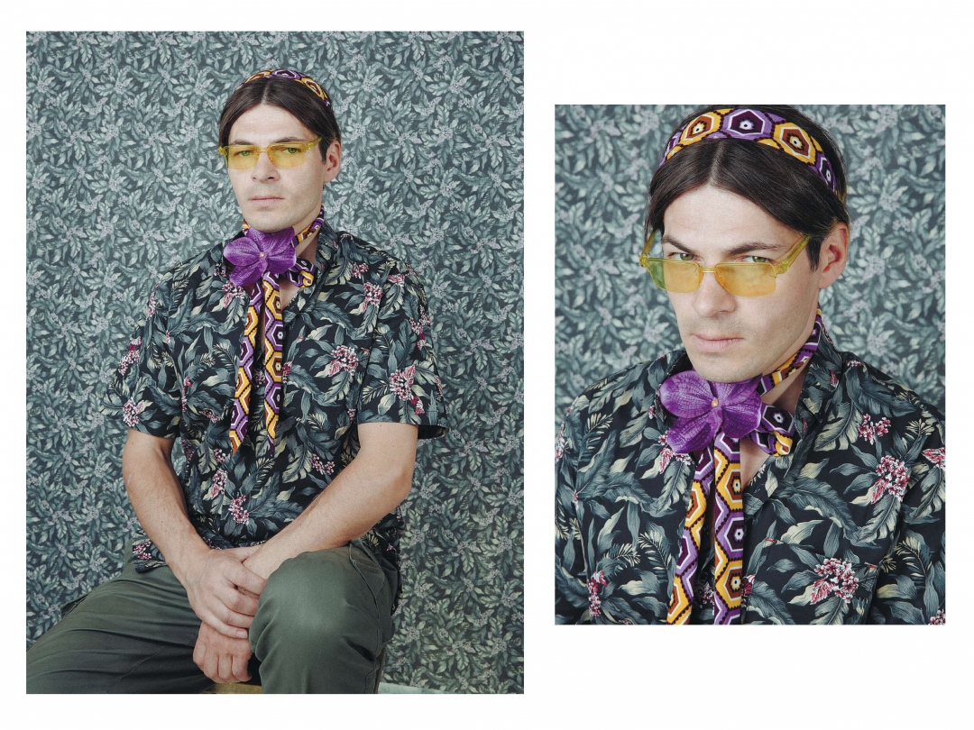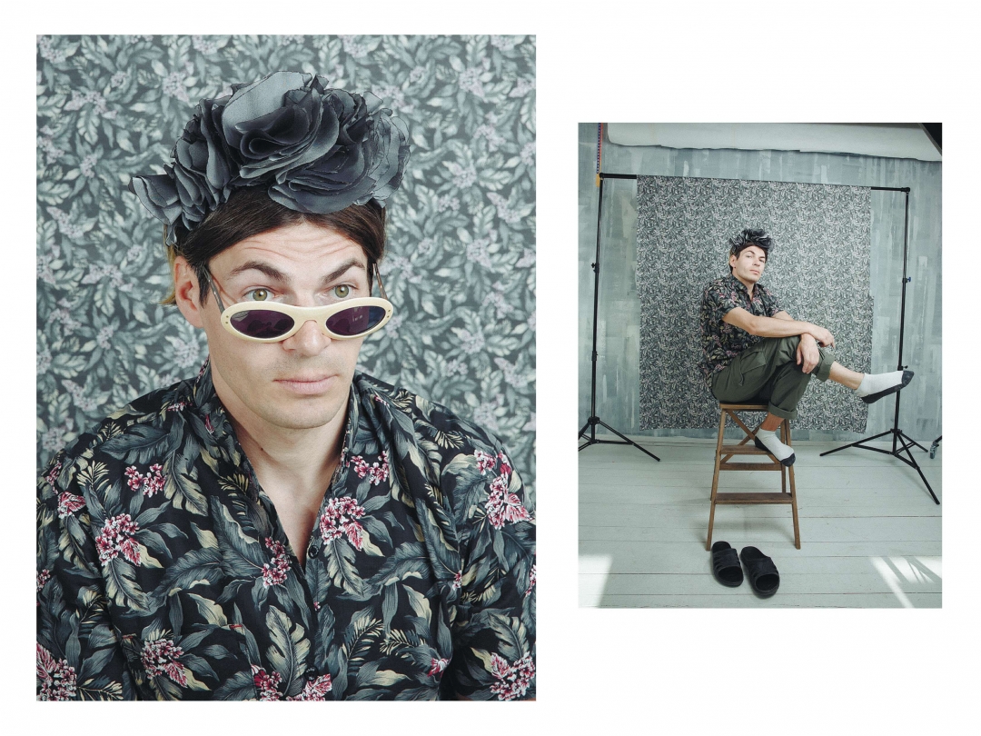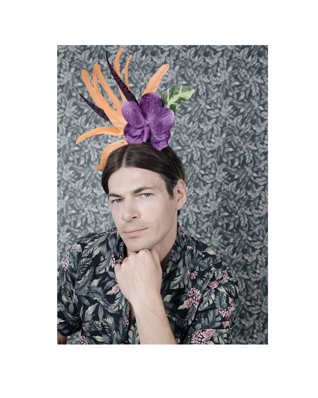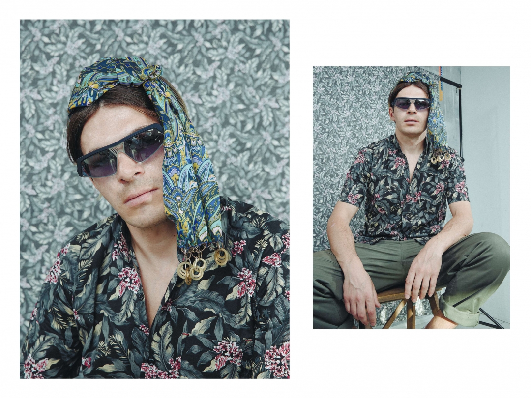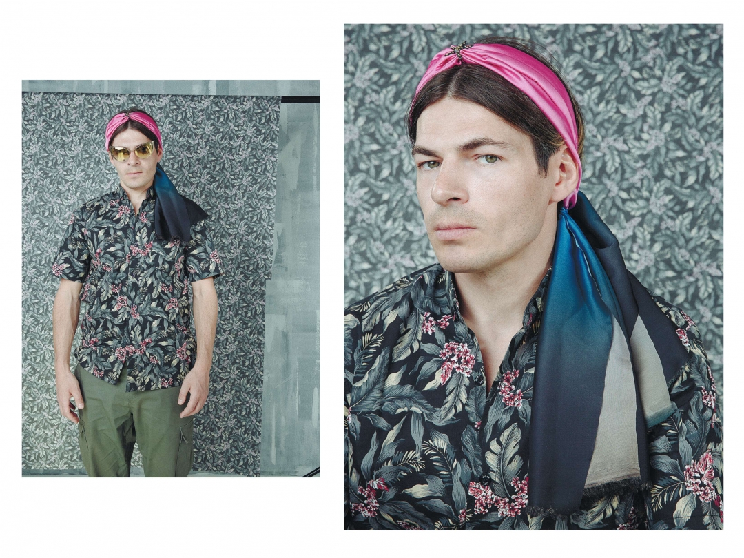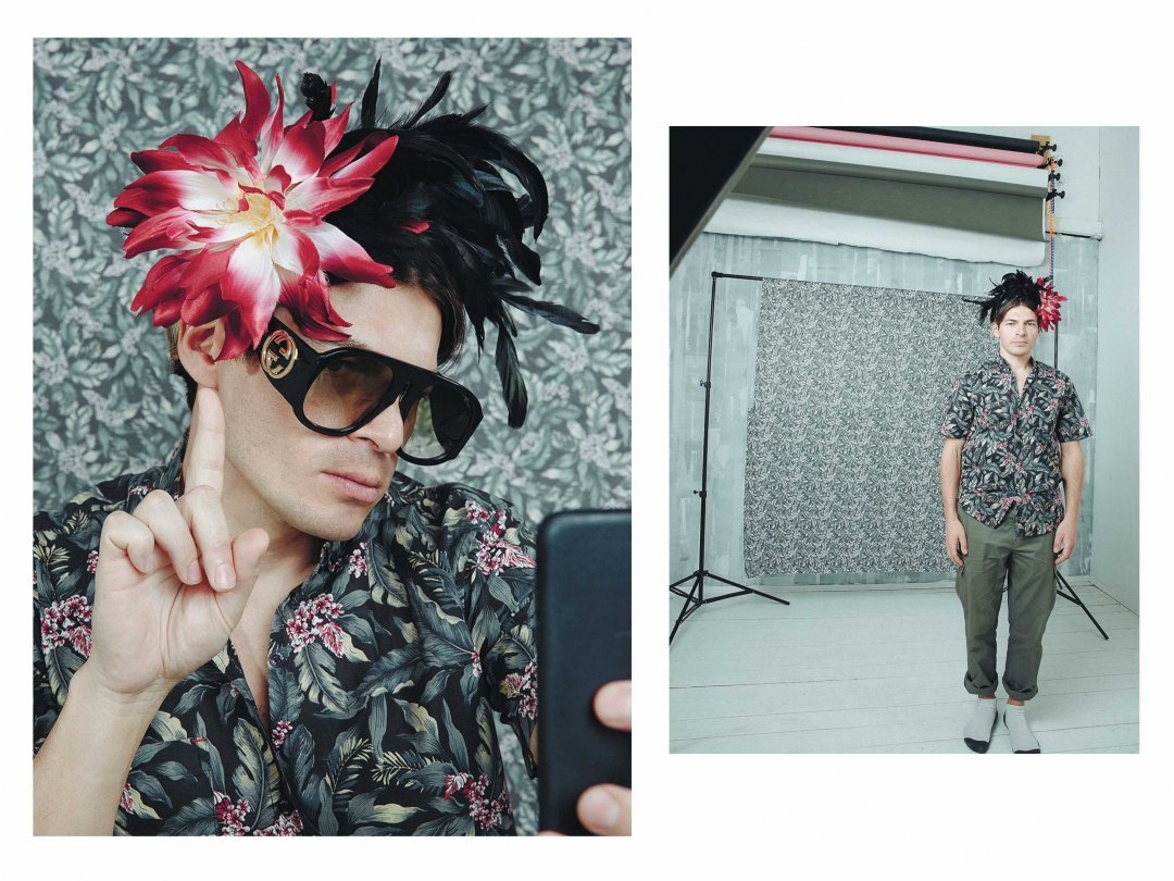 В мудборде ободков из перьев, шелковых платков и искусственных орхидей — путешествие на Бали, где голова всегда должна быть под защитой от палящего солнца. А идею съемки Алина позаимствовала из фильма «Страна Садов», где главный герой получил рубашку из остатков ткани на отделку ванной комнаты. «И вот он стоит в ней на фоне такой же стены с абсолютно невозмутимым видом, — рассказывает дизайнер. — Хотя, если честно, никаких особенных референсов мы не придерживались, а просто веселились и дурачились под миксы Itallika».