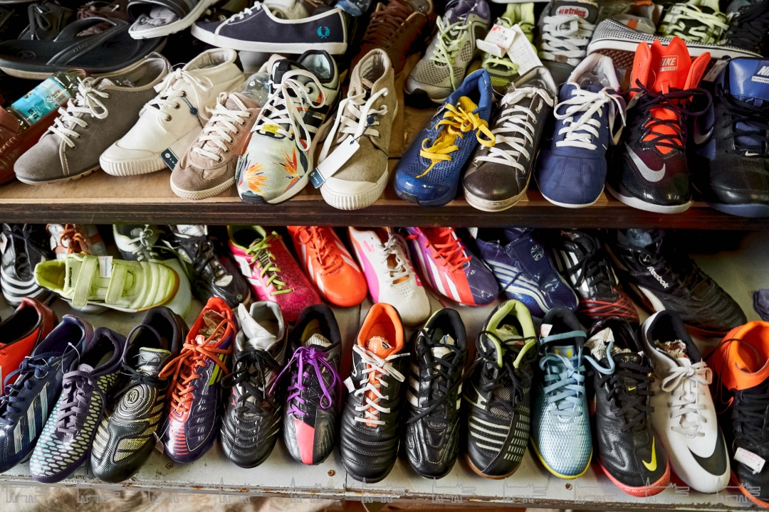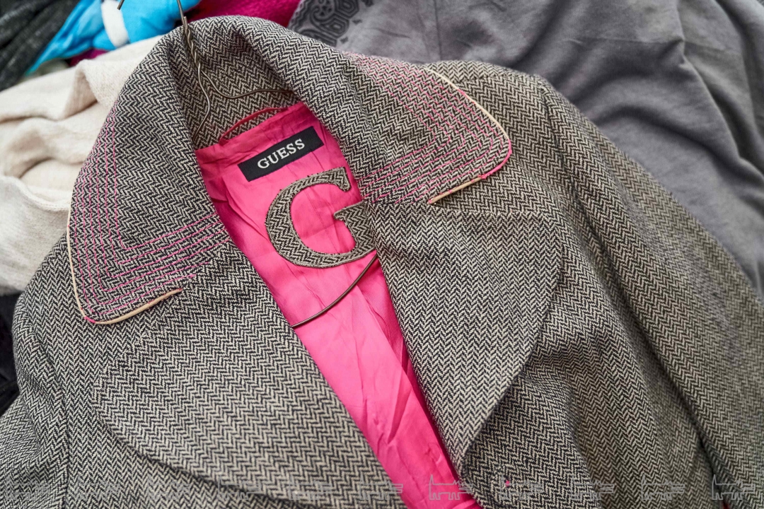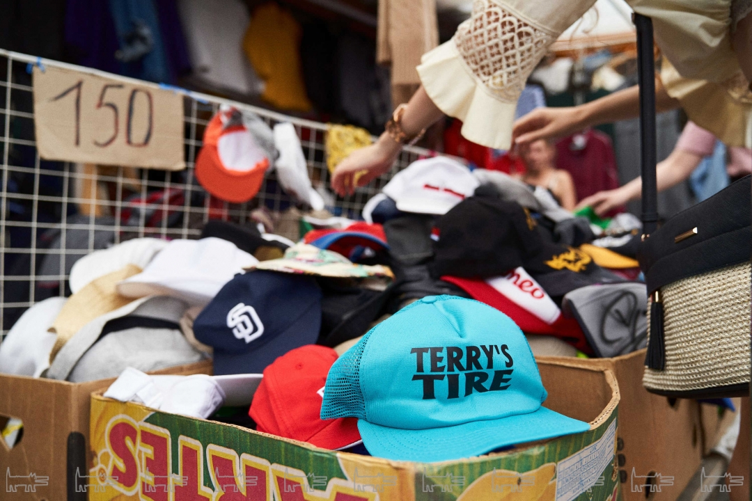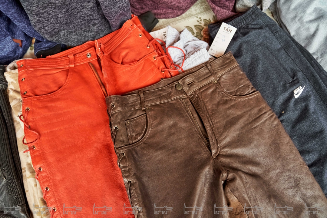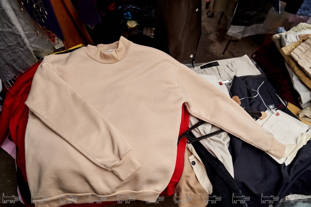 Чтобы найти вещи за бесценок, нужно в прямом смысле лезть на дно кучи: футболки, бейсболки, бадлоны и шарфы лежат на раскладушках между рядами «Уделки». Мы обнаружили жакет с перламутровыми пуговицами, кожаные брюки с ковбойской шнуровкой, детский комбинезон с принтами-жирафами и мягкий базовый свитшот не хуже, чем в коллекциях UNIQLO и NNedre.