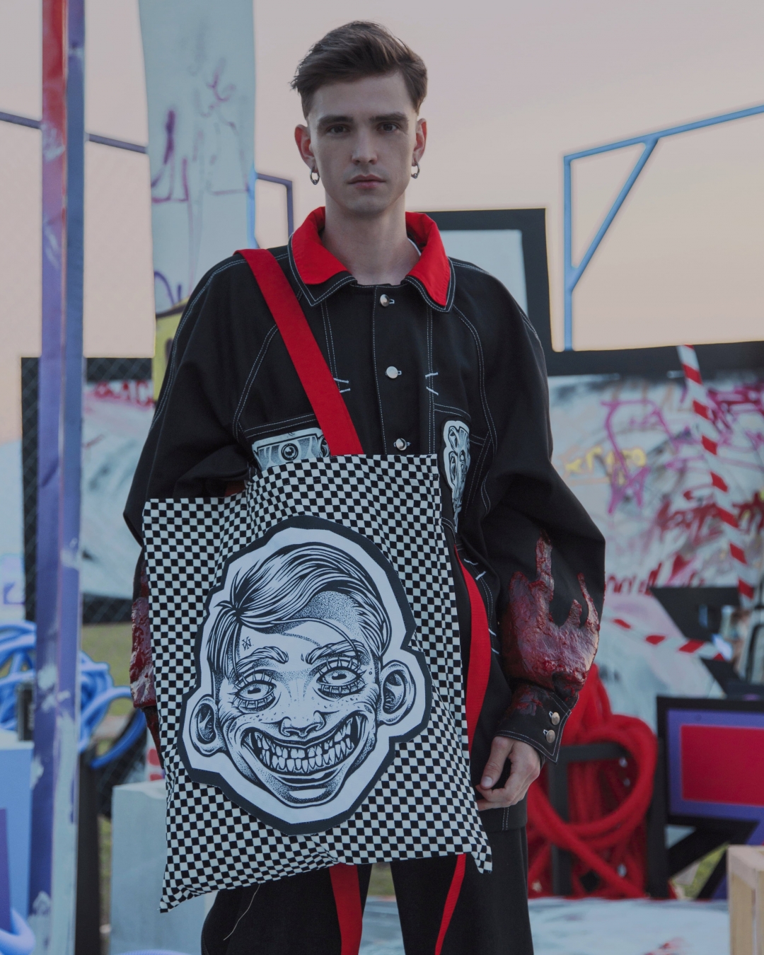 Для коллаборации Миша WERT159 подготовил диптих-иллюстрацию в своем фирменном "дуалистическом" стиле, а Артем адаптировал свою же картину для мужской джинсовой куртки. С ее рукавов стекает то ли краска, то ли кровь, как мысль, что все художники современного мира начинали свой путь на небезопасных и бедных улицах».
