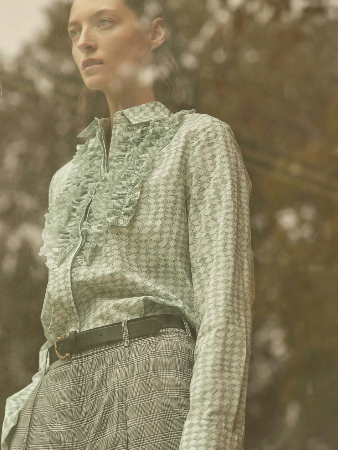 Бренд из Петербурга BELKA перерос из формата «одежды для работающих женщин» в концепцию «вещи для ролей, которые мы играем каждый день». Его новая осенне-зимняя коллекция сделана с отсылками к фильмам 70-х годов и героиням Анны Карины, Джин Сиберг и Моники Витти. Шерстяные куртки-косухи, широкие брюки-бананы, полупрозрачные свободные рубашки и блузы с геометрическим принтом будто сошли с черно-белых экранов в новую жизнь: осовременивают их объемные силуэты, цифровые принты и удобная, подходящая под ритм города, посадка.
