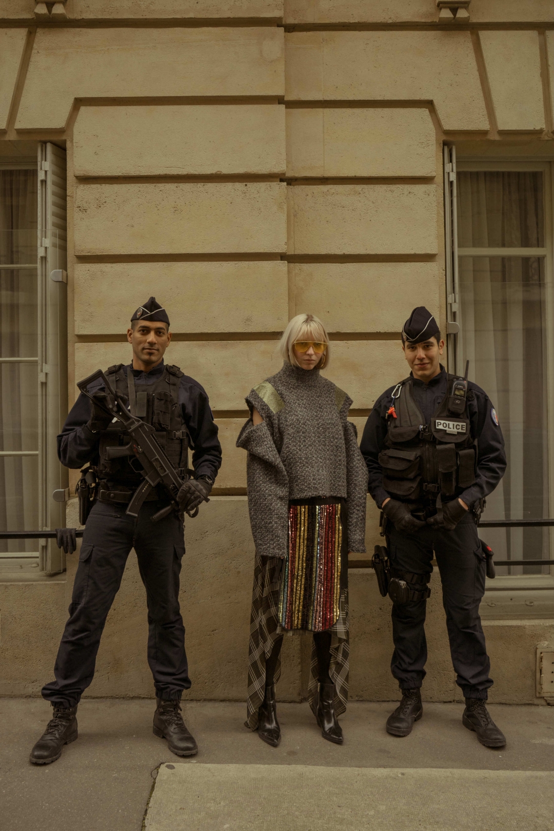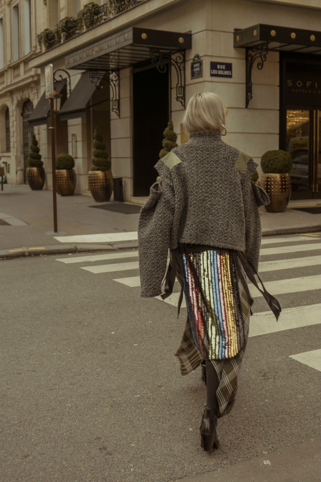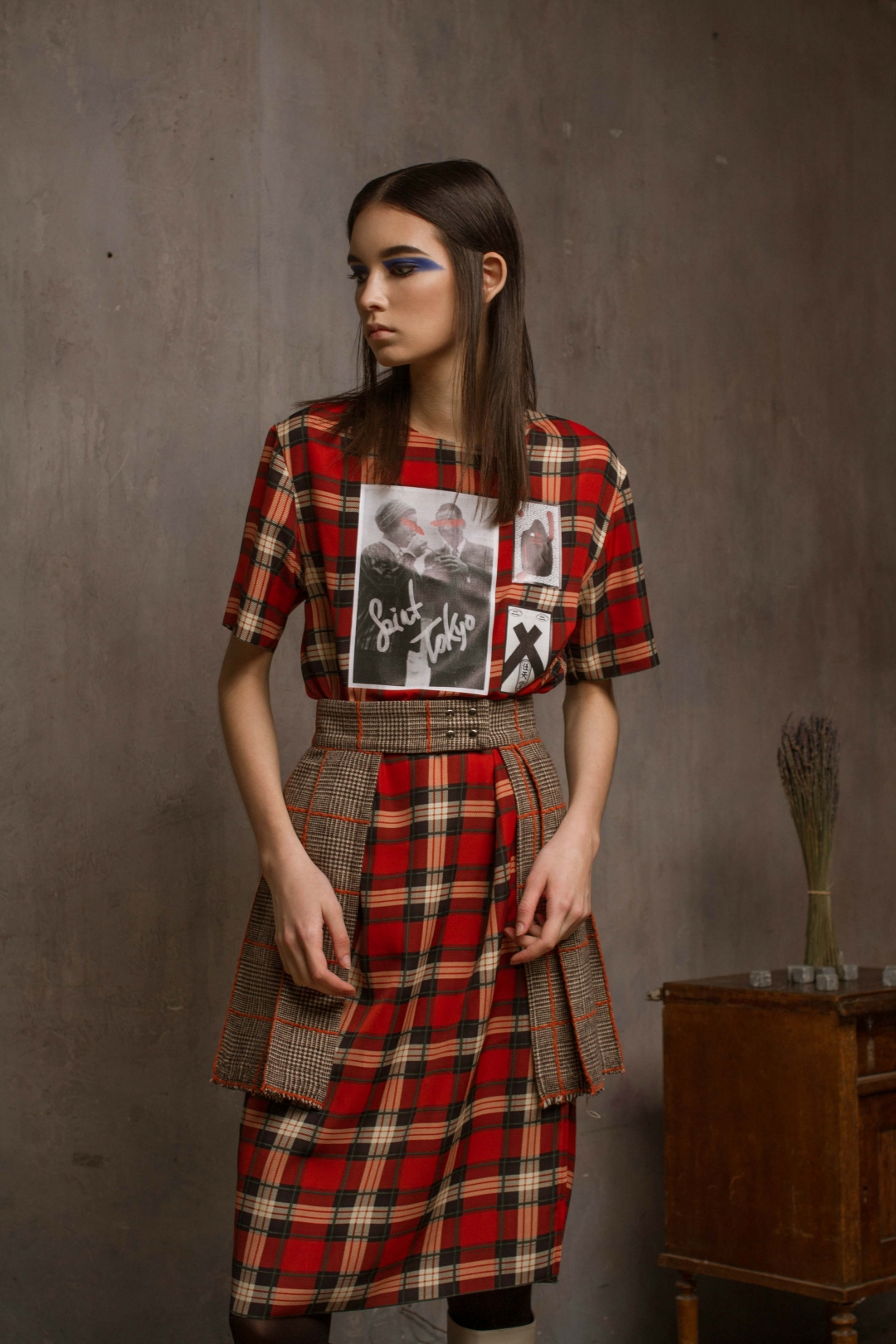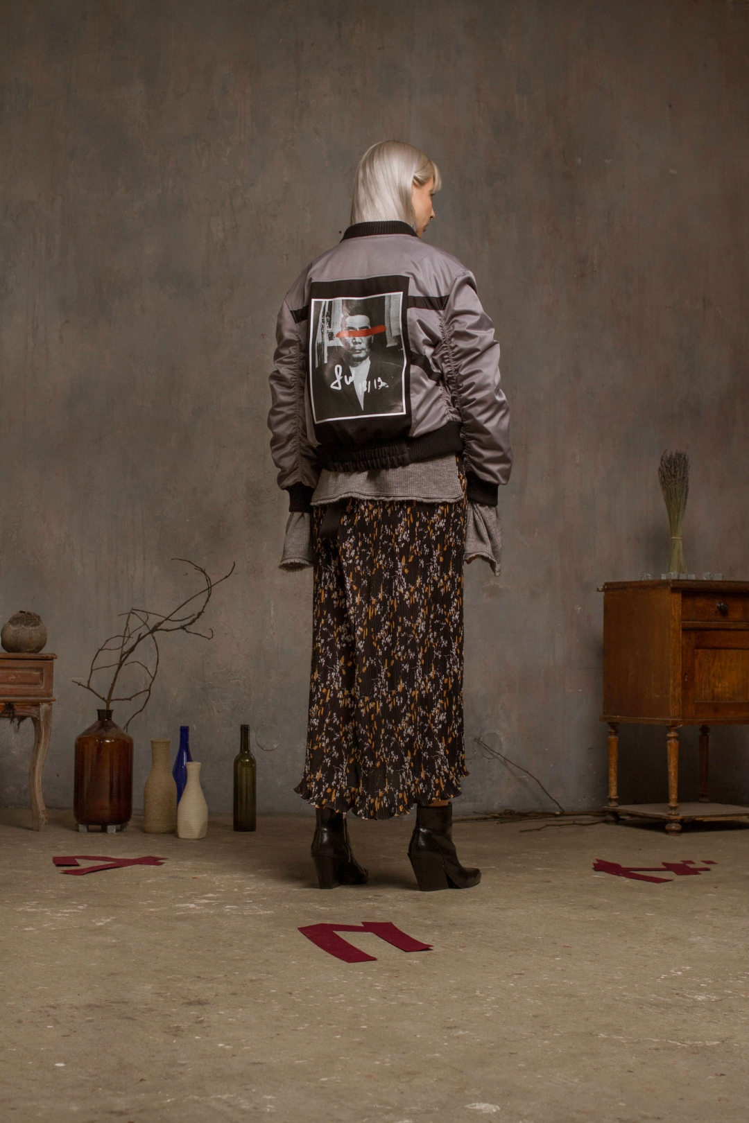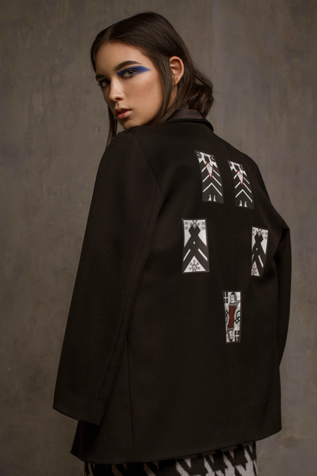 Я раздобыл фотографии едва ли не единственной женщины-главы якудза — Фумико Таока. Она была женой лидера крупнейшей группировки «Ямагути-гуми» Кадзуо Таока: когда он умер, а преемника посадили в тюрьму, Фумико возглавила японскую мафию. Портреты семьи с перечеркнутыми из этических соображений глазами стали принтами на графичных бомберах и клетчатых платьях, а карты (термин «якудза» произошел от названия карточной комбинации, делающей игрока проигравшим) украсили жакеты, футболки и плащи.