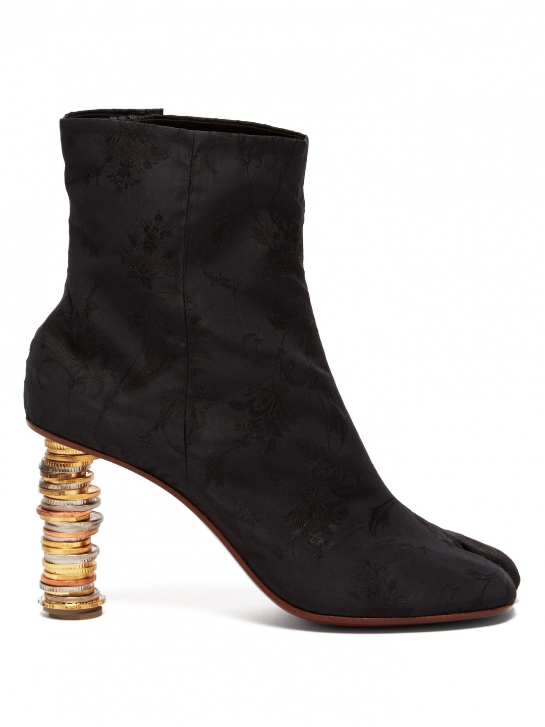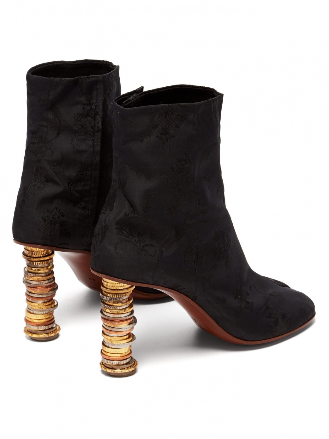 Косплеить Монеточку в этом сезоне проще простого: в осенне-зимней коллекции Vetements есть ботильоны на фигурном каблуке, собранном то ли из мелочи, то ли из жетонов метрополитена. Ими Демна Гвасалия продолжил обувную линейку, сконструированную из «подручных средств»: сапоги и ботинки из прошлых коллекций дизайнера «стояли» на фломастерах и зажигалках.
