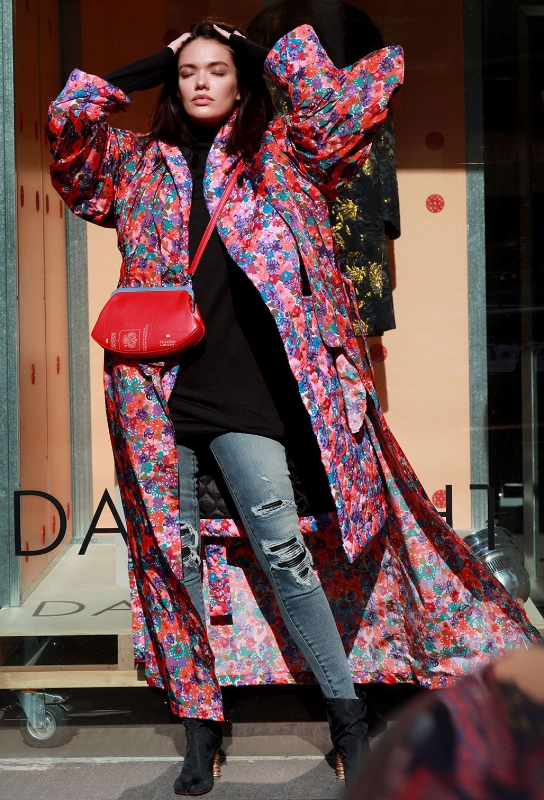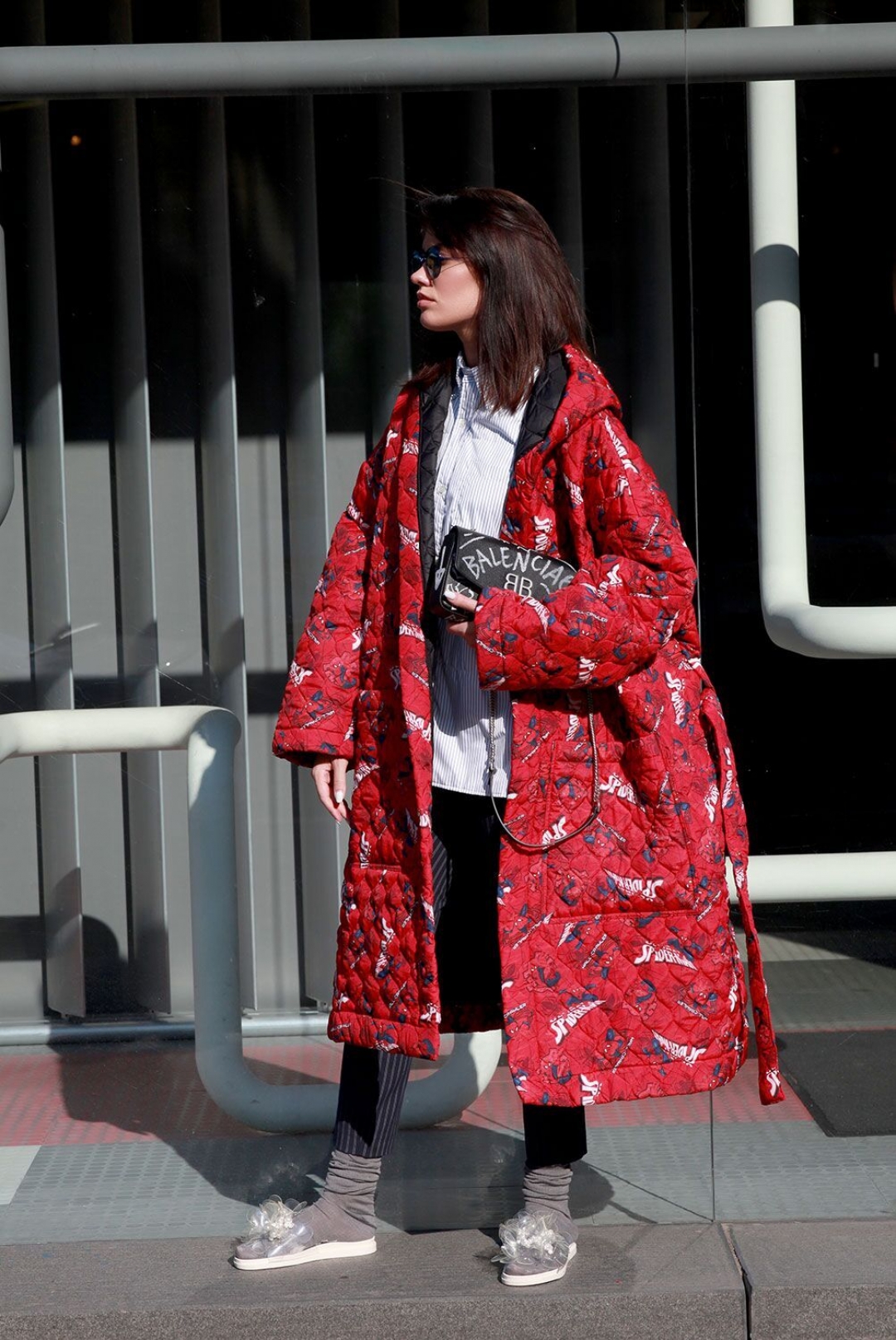 В коллекцию также вошли «фирменные» гигантские худи, платья с узорами в мелкий цветок и сапоги-чулки. Правда, в этом сезоне дизайнер уделил больше внимания декору, деталям и новым формам. Одежду украшают нашивки и рельефные надписи, а в образах сочетаются клетка, полоска, граффити и камуфляжный принт.