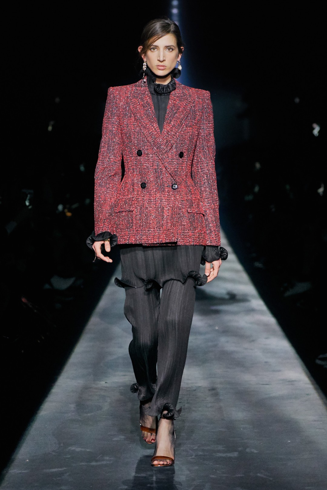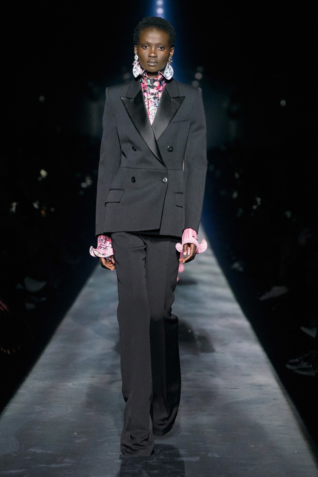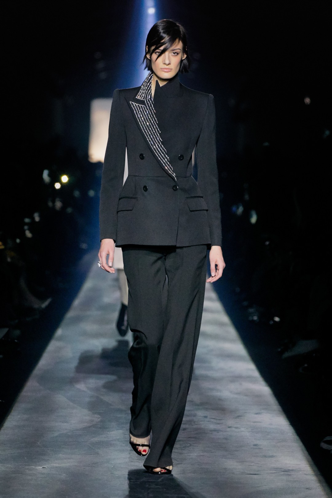 Помимо цветочных и трикотажных нарядов, в коллекцию Givenchy вошли многочисленные брючные костюмы. Часть из них была с нарочито увеличенной линией плеча (в лучших традициях послевоенной эпохи), а другая — с зауженным и приталенным силуэтом (как любили носить в гранжевые 1990-е).