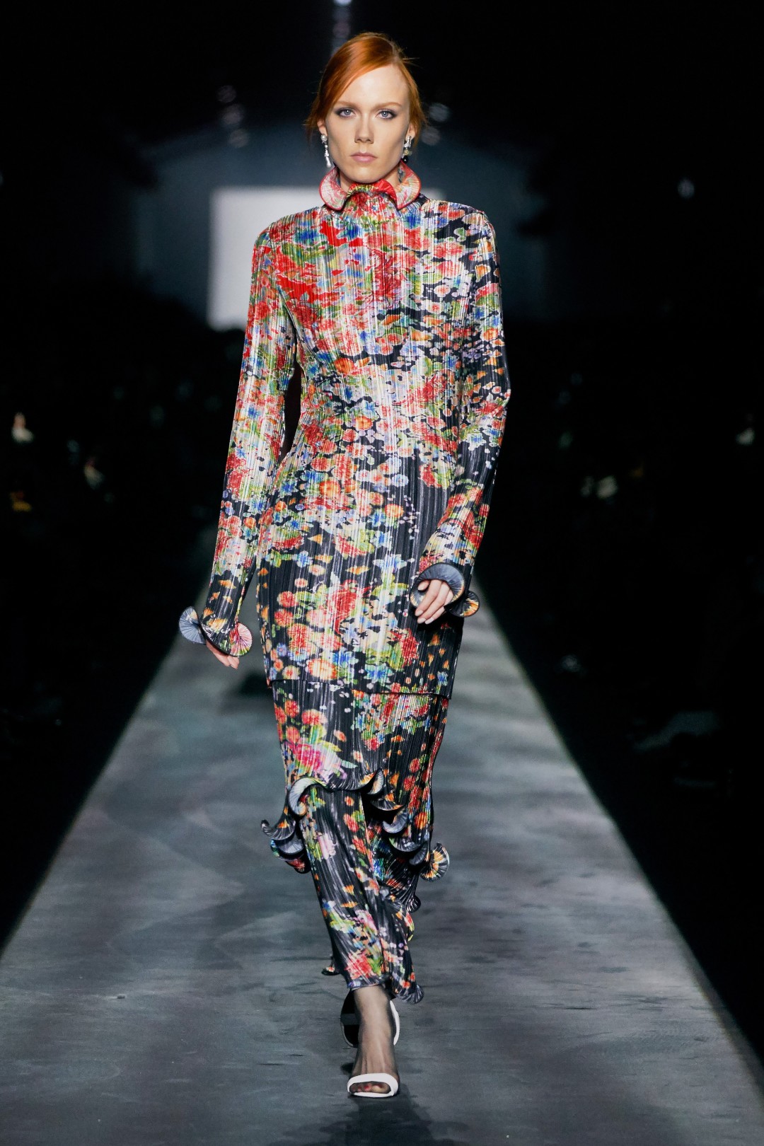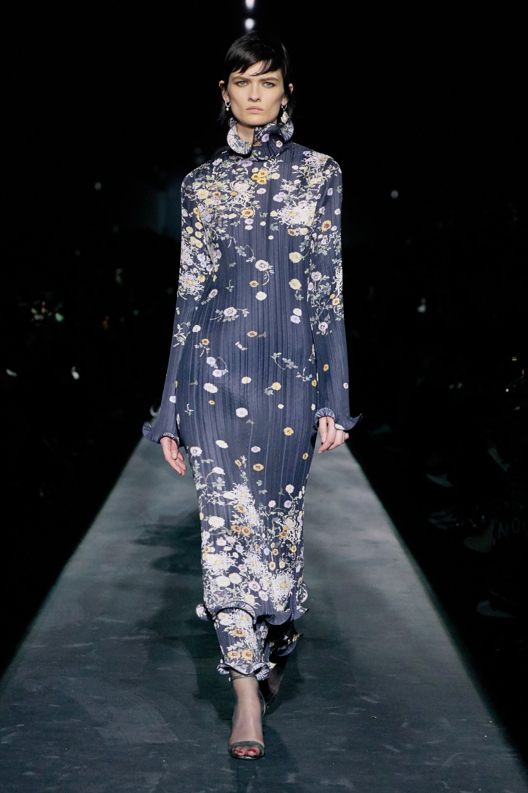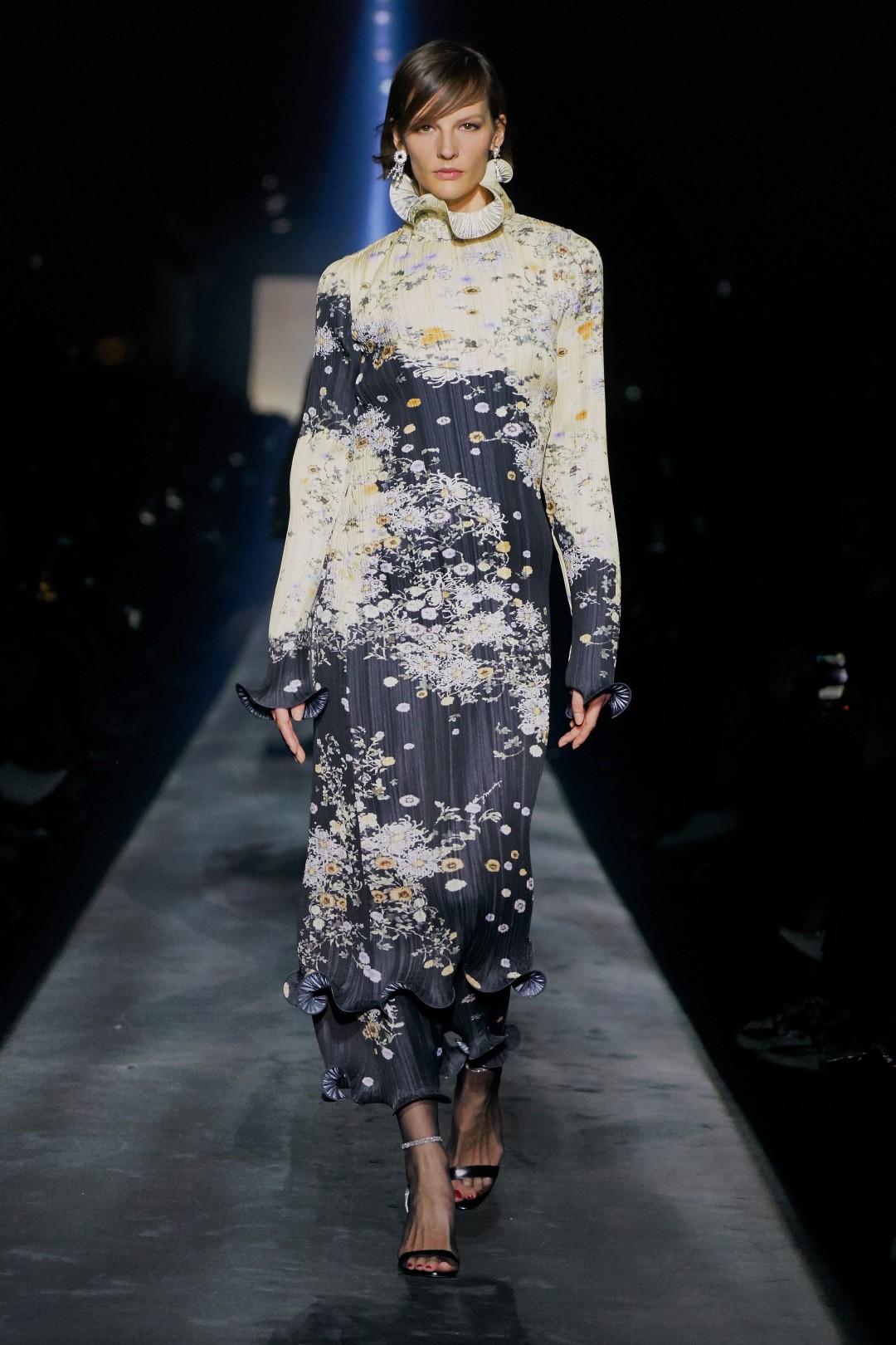 Новую коллекцию для Givenchy Клэр Уэйт Келлер назвала «Зима в Эдеме»: это объясняет обилие цветочного принта, нетипичного для осенне-зимнего сезона. Ромашками, розами и георгинами были украшены шелковые платья в пол, комплекты свободного кроя и бадлоны, торчащие из-под трикотажных вещей. Их Клэр «срисовала» с китайских ваз, а также с собственных представлений о райском библейском саде.
