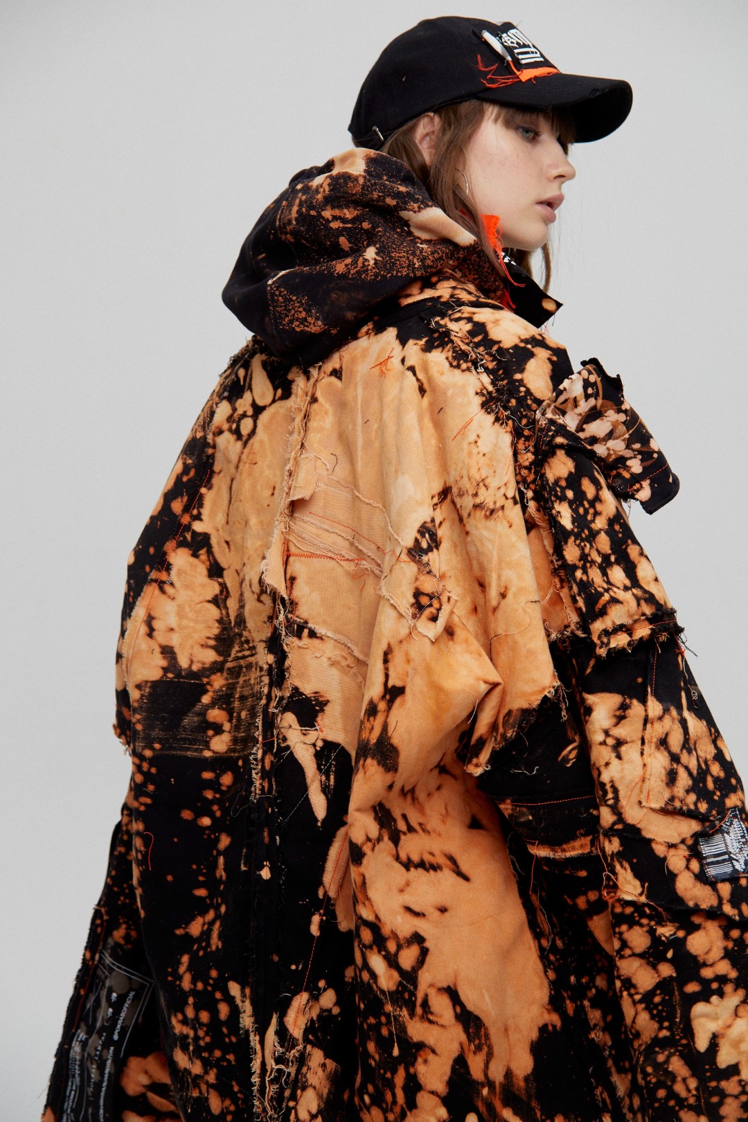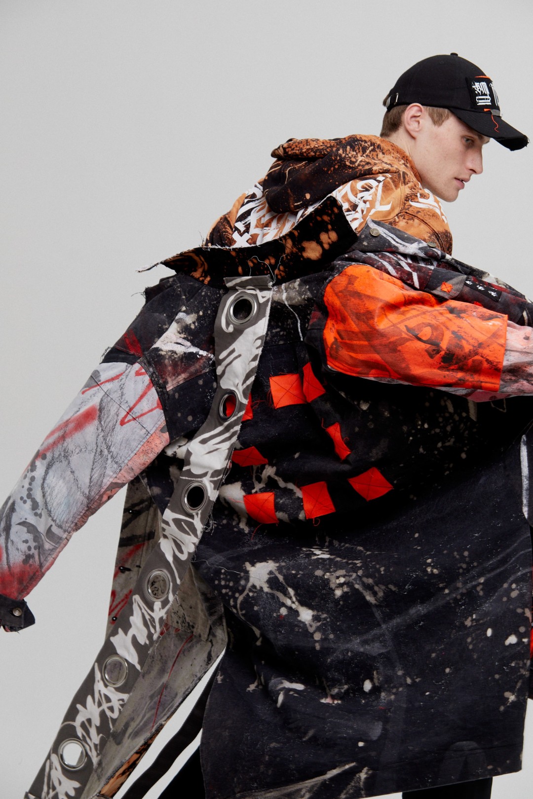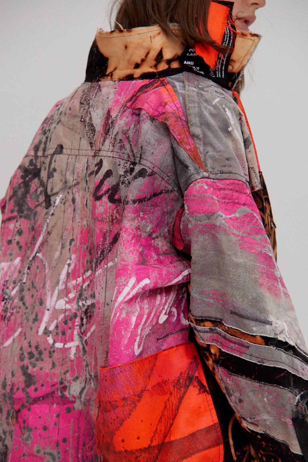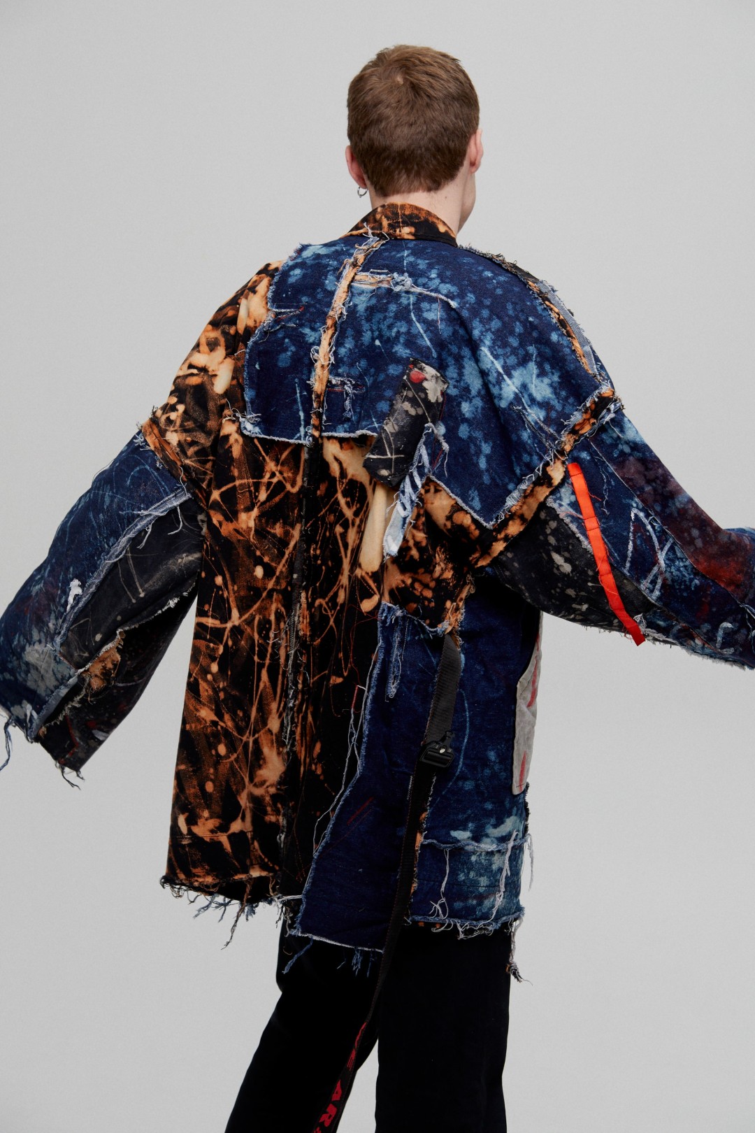 «Я считаю важным показать зрителю не просто абстрактные позиции одежды, но связь места и времени, руки художника, краски, полотна и объекта, в который все трансформируется и сливается. Каждая вещь— связь искусства и моды, экспериментов и традиций, сама по себе является манифестом: вручную расписанная ткань, вырезанные лоскуты из рабочей робы, вытравленный деним, шелкография — все вместе собирается в уникальную композицию, сшивается, закрепляется люверсом и объединяется в цельный образ и высказывание»