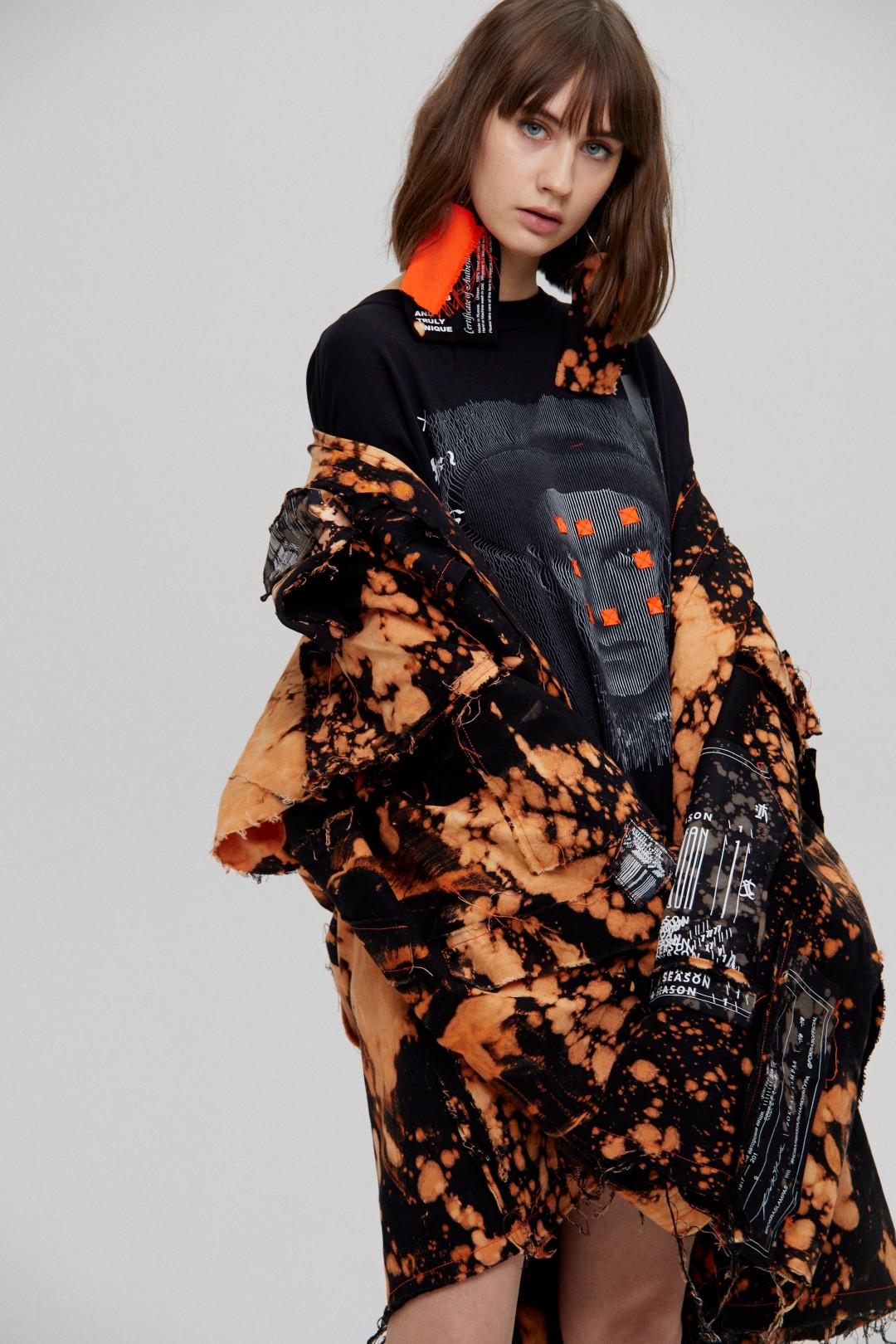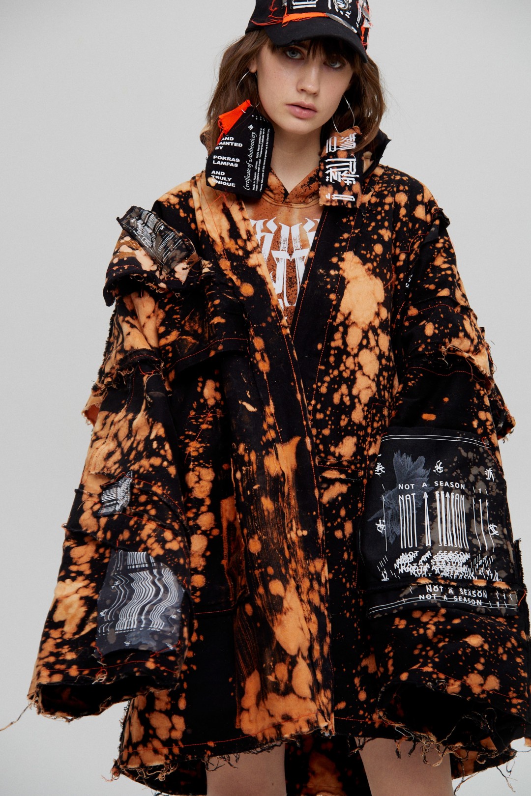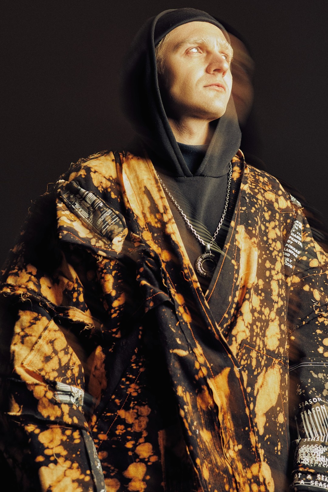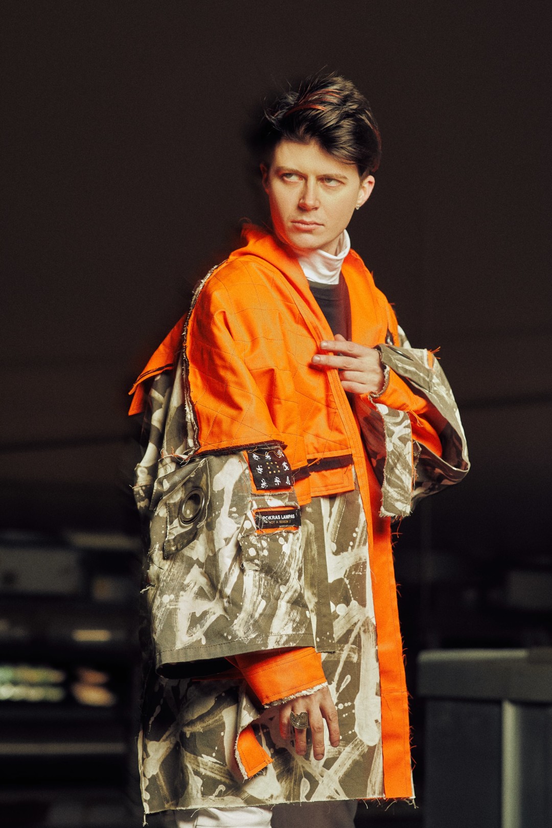 «Я считаю важным показать зрителю не просто абстрактные позиции одежды, но связь места и времени, руки художника, краски, полотна и объекта, в который все трансформируется и сливается. Каждая вещь— связь искусства и моды, экспериментов и традиций, сама по себе является манифестом: вручную расписанная ткань, вырезанные лоскуты из рабочей робы, вытравленный деним, шелкография — все вместе собирается в уникальную композицию, сшивается, закрепляется люверсом и объединяется в цельный образ и высказывание»