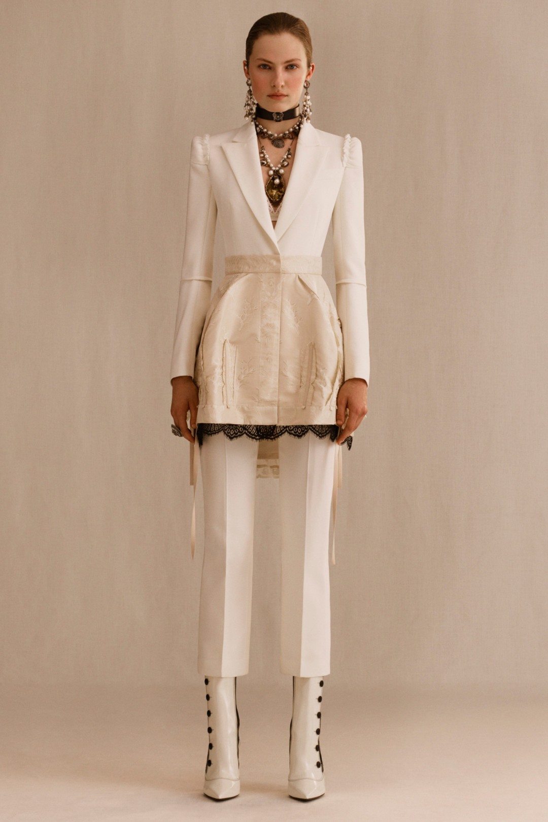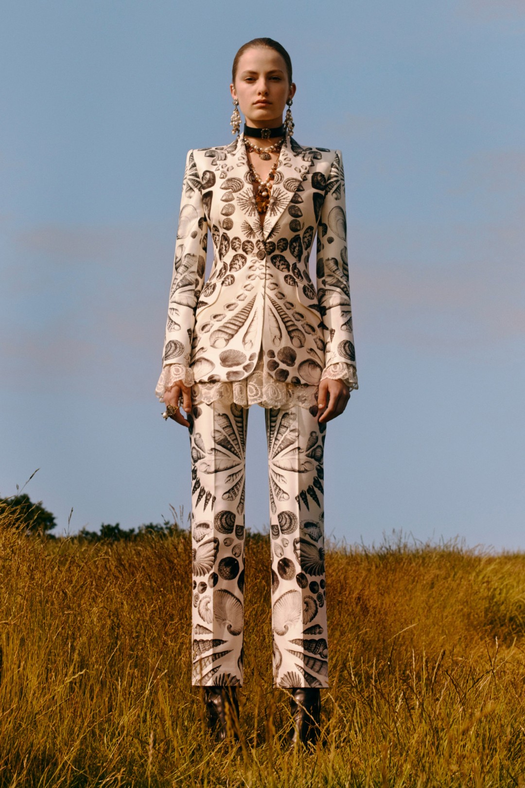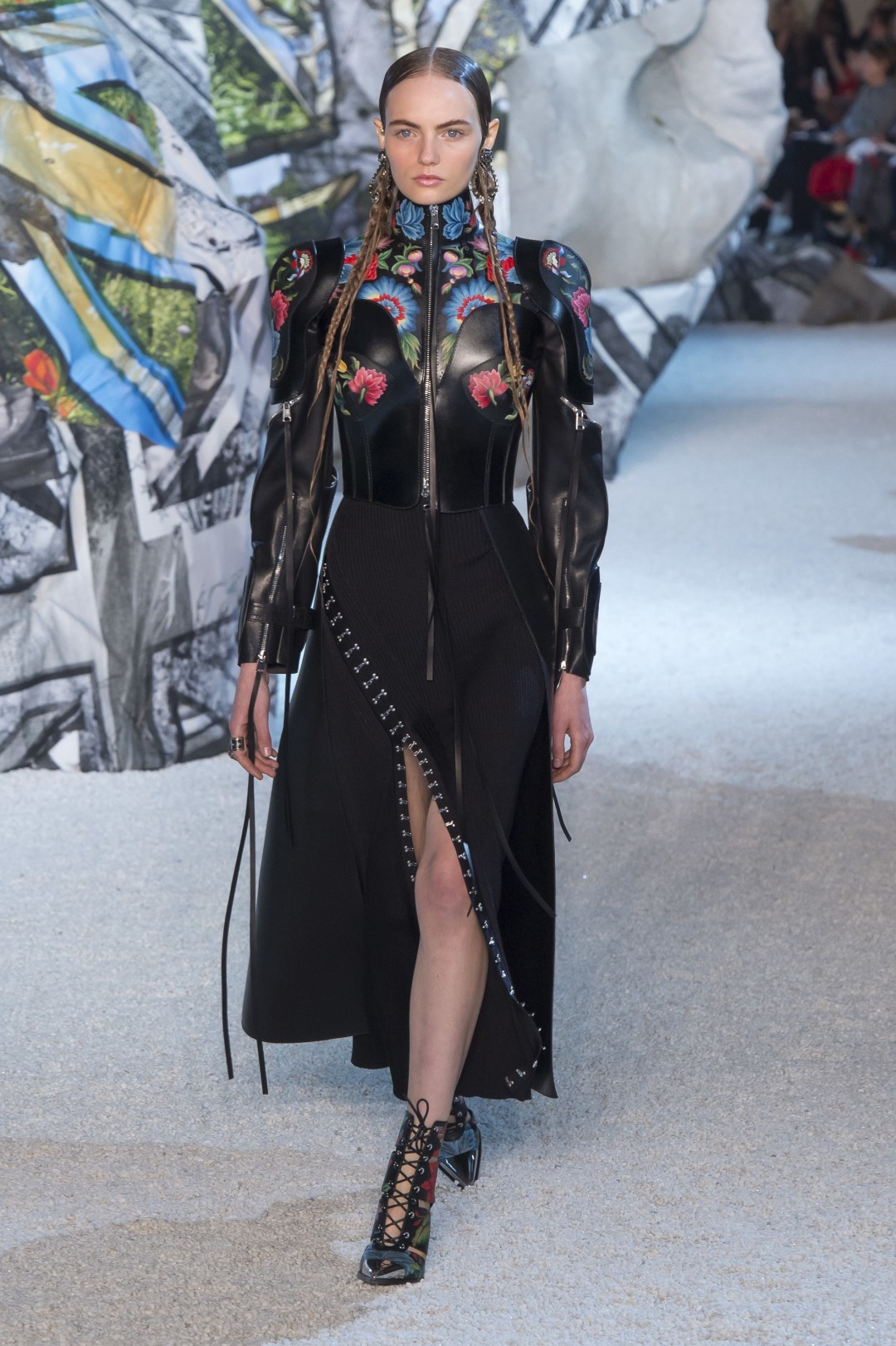 В Петербург приехали пре-коллекция и часть подиумной коллекции Alexander McQueen. Первую креативный директор Сара Бертон посвятила двум героям британской истории: палеонтологу Мэри Эннинг, сделавшей ряд открытий в области морской фауны юрского периода (отсюда — платье с принтами-ракушками) и писателю Томасу Харди, написавшему резонансный роман викторианской эпохи «Тэсс из рода д’Эрбервиллей» (отсюда — вещи с объемными плечами и кружевной отделкой). Викторианская тема продолжилась и во второй, весенне-летней коллекции марки: на этот раз рюши и вышивки перебрались на кожаные корсеты, спортивные брюки, киберпанковские ботинки и архитектурные сумки на цепочках.