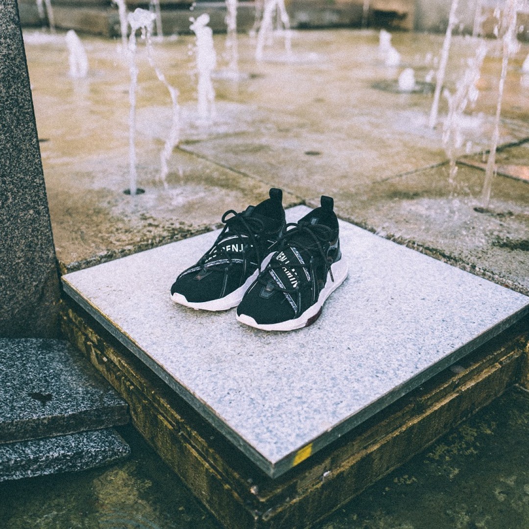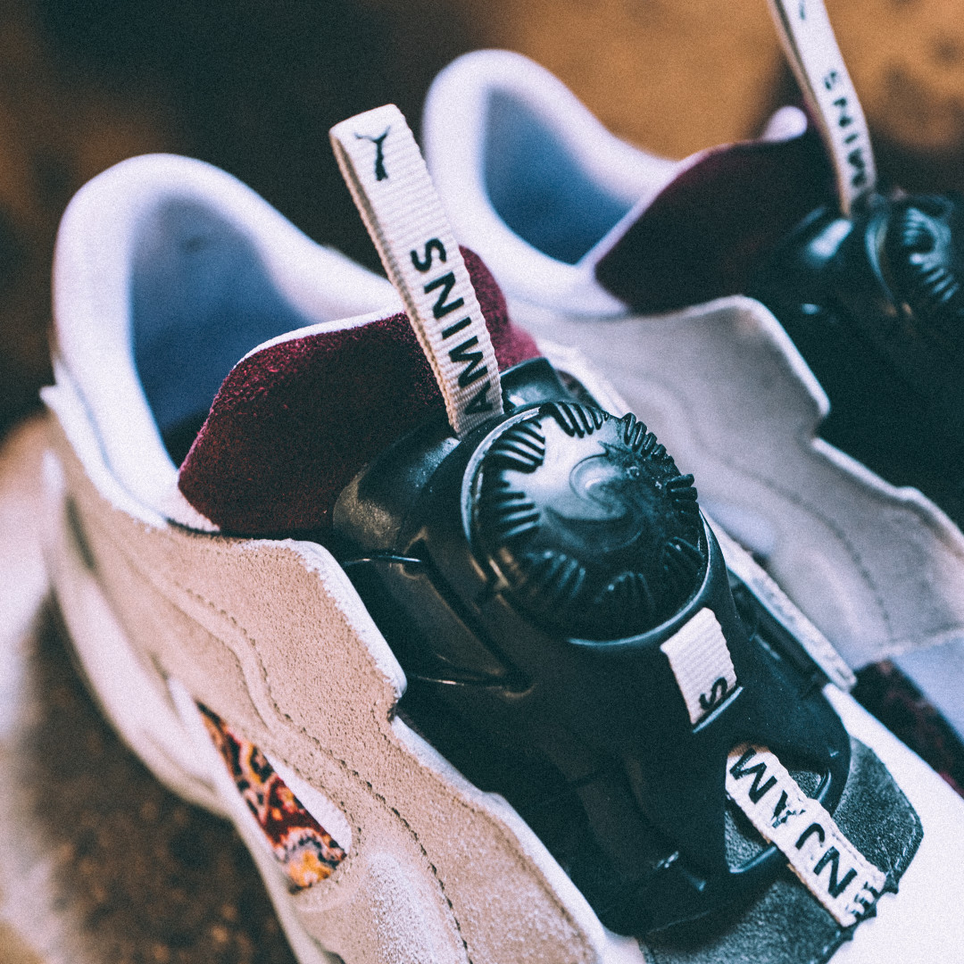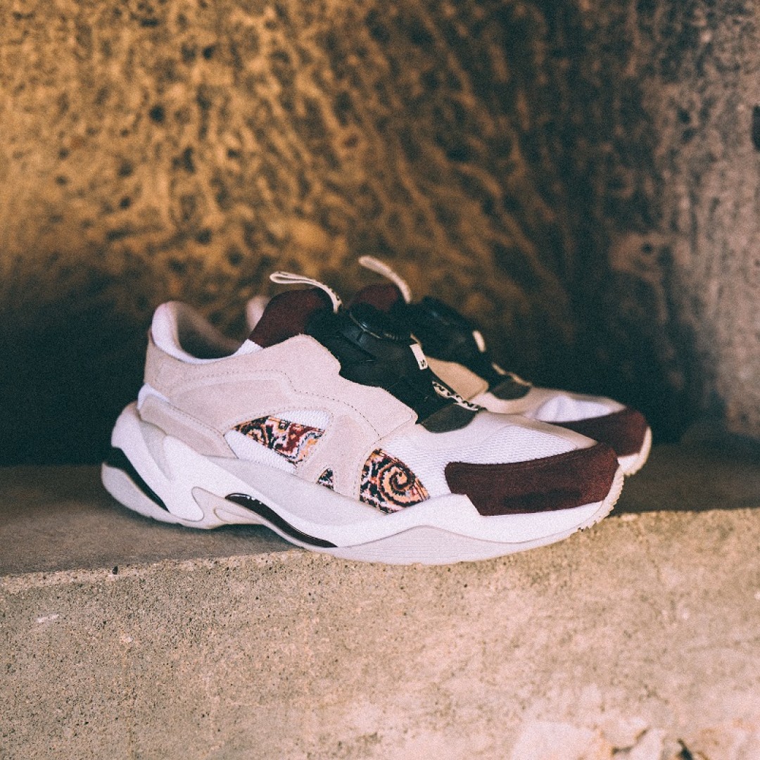 Например, THUNDER Disc Les Benjamins — гибрид с подошвой от модели Thunder Spectra и верхом от Disck Blaze. А еще они созданы с применением PUMA Disc, технологии, которая умеет фиксировать кроссовок без использования шнурков. Это самая яркая модель в капсуле — из-за замшевых цветных вставок в сочетании с уже упомянутым ярким орнаментом.
