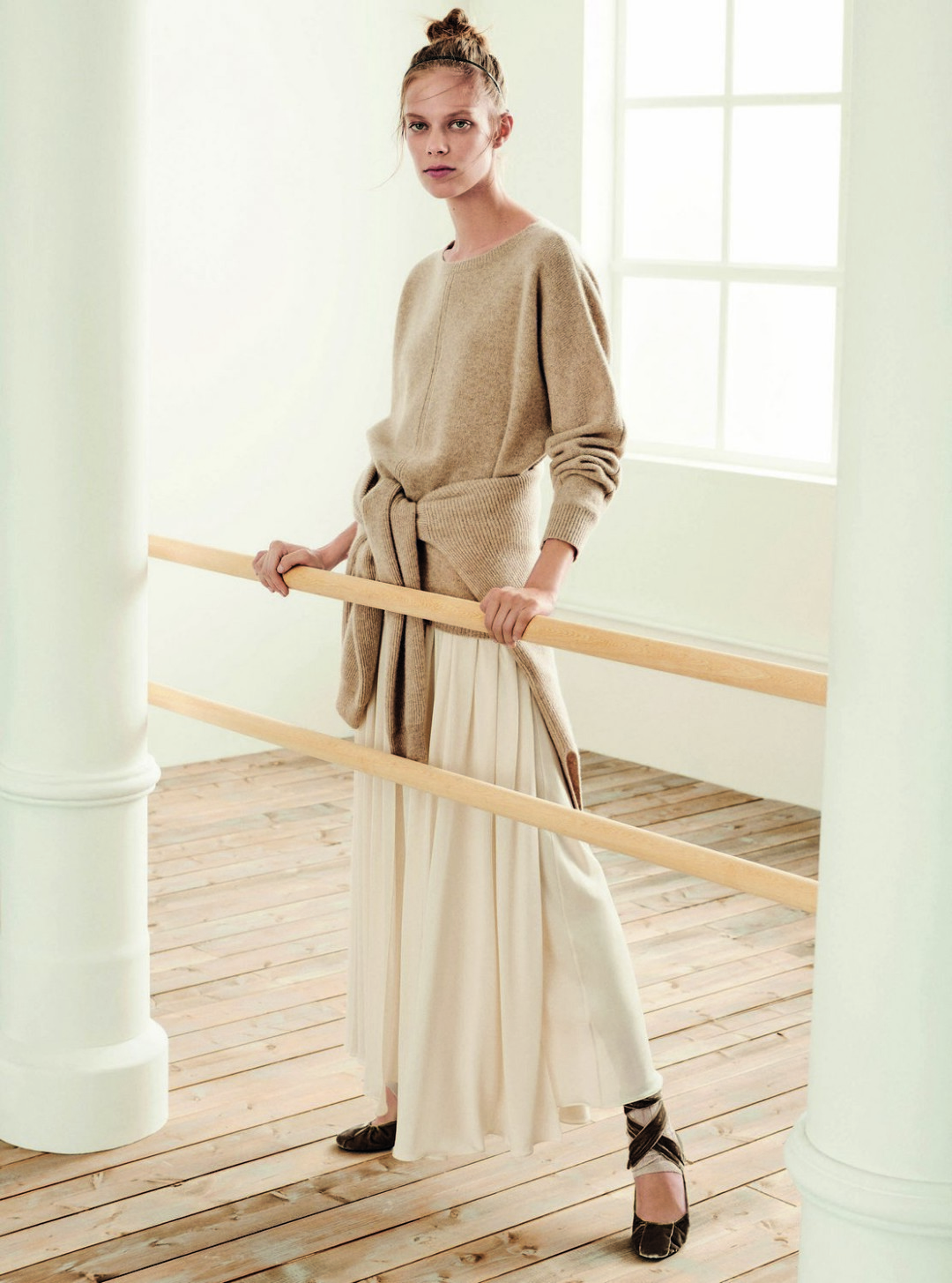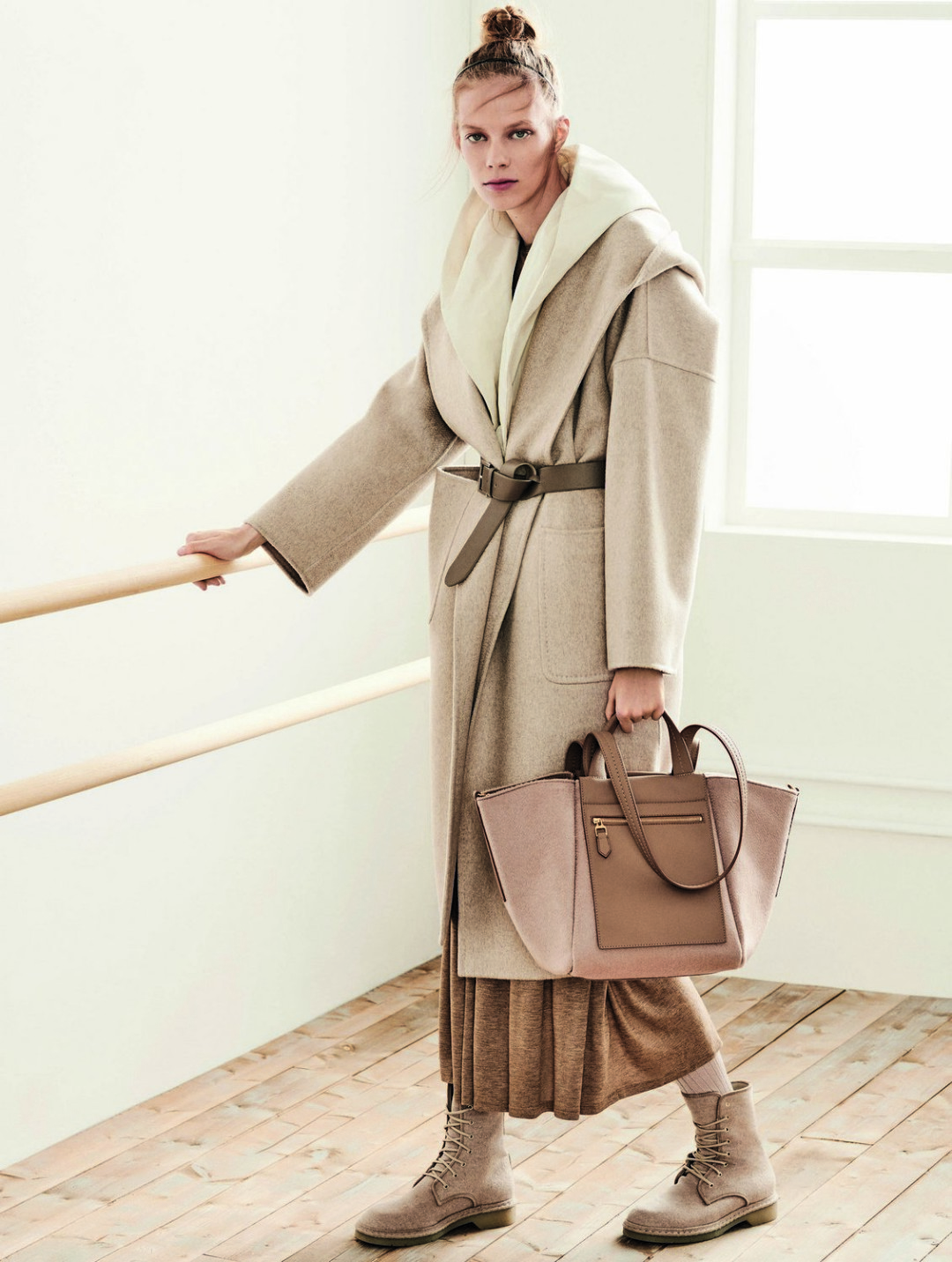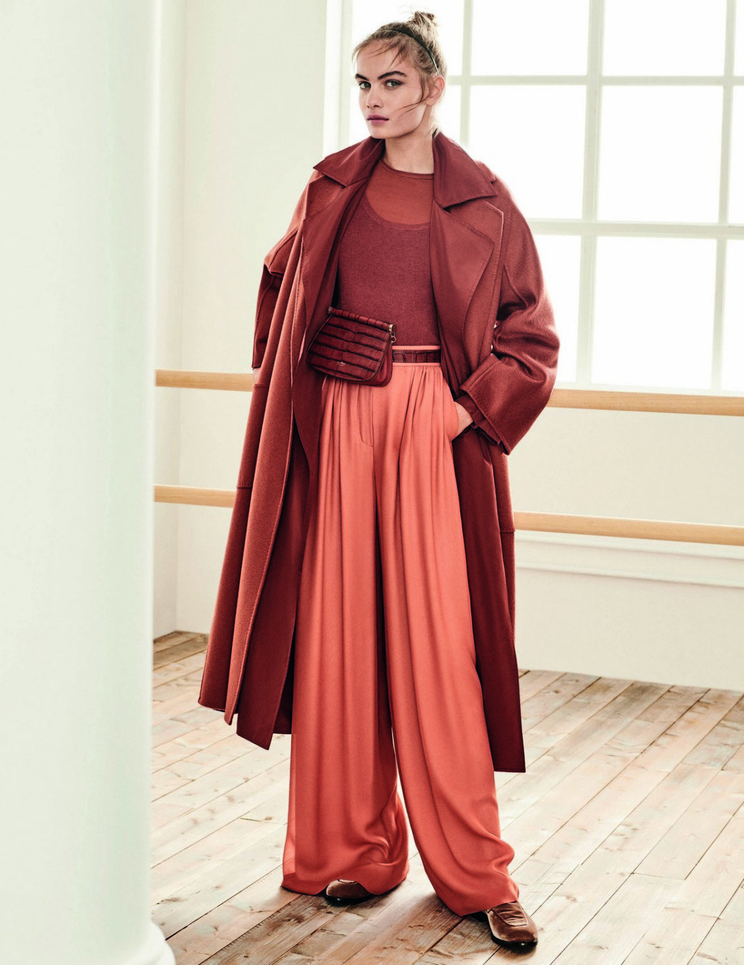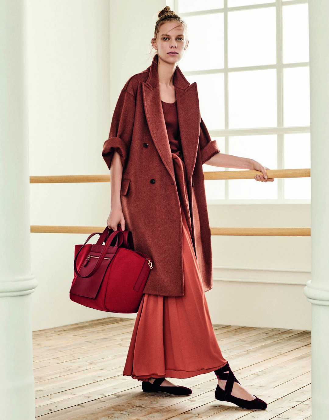 Подчеркнуть утонченную фигуру можно с помощью облегающих топов, тонких леггинсов в рубчик и мягких бархатных балеток с завязками на щиколотке. Среди осенних аксессуаров – объемные двусторонние сумки Anita, которые перекликаются с тканями пальто, и кожаные ремни, завязанные узлом на талии.