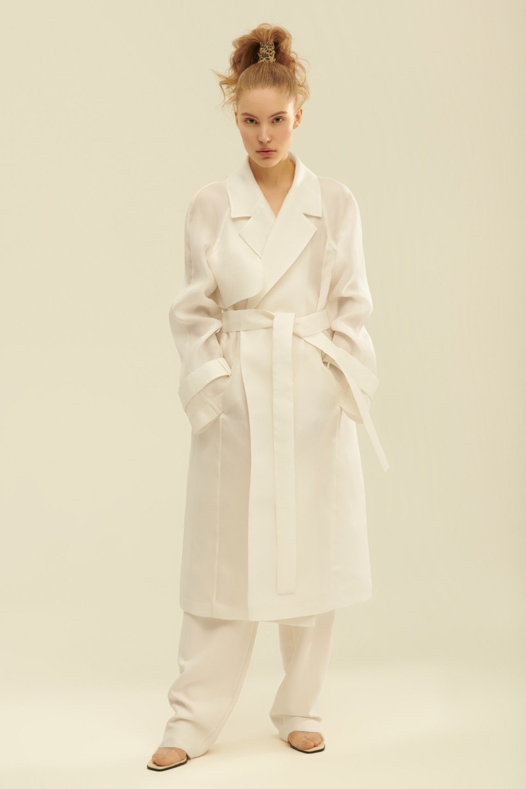 Тем, у кого уже есть тренчкоты всех оттенков бежевого и коричневого, советуем обратить внимание на плащи белого цвета — от Walk of Shame, Belka или osome2some. Первый имеет фактурный принт, имитирующий потрескавшуюся краску, второй отличается рукавами-бутонами, которые делают его похожим на платье, а третий создан из полупрозрачной органзы и отлично подходит как для теплой осени, так и для холодного лета. Носить их советуем с обувью такого же цвета — казаками, лоферами или ботинками Dr. Martens.