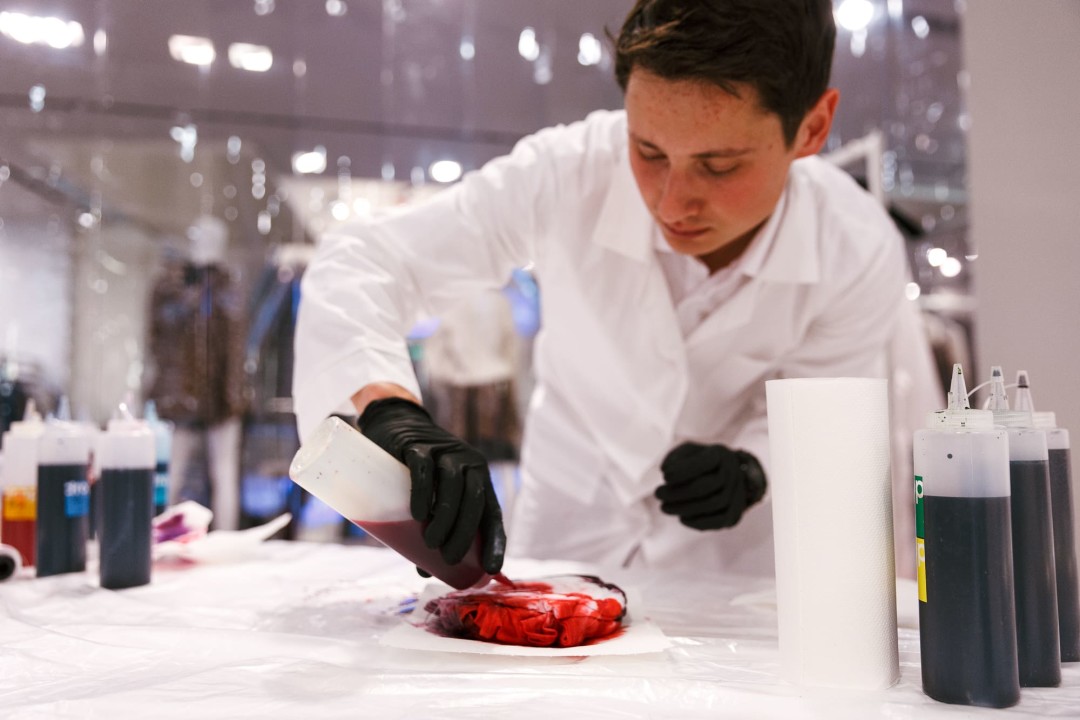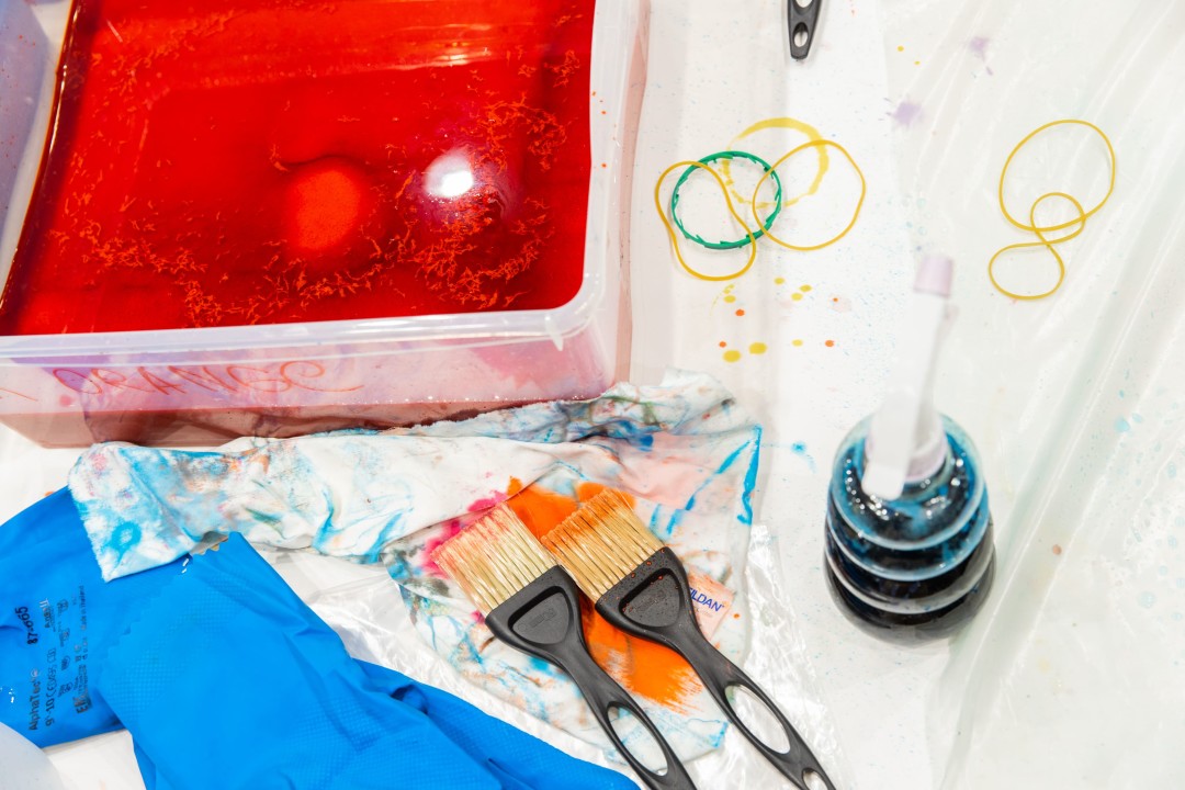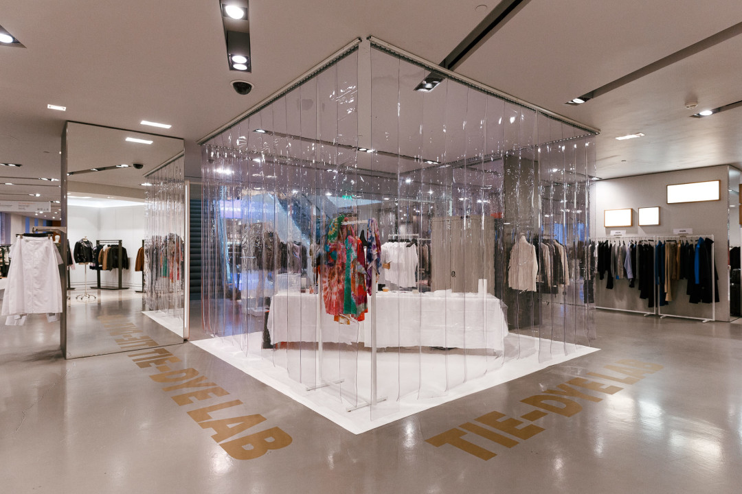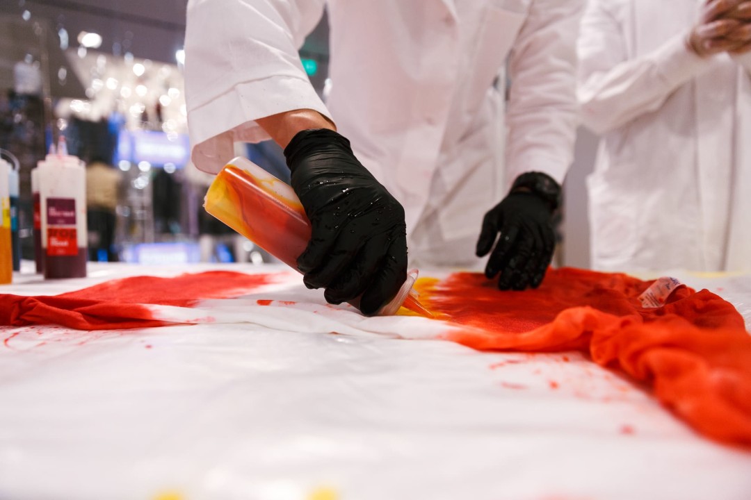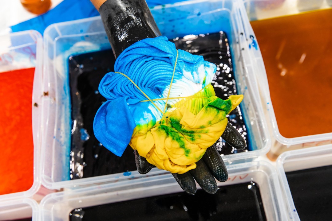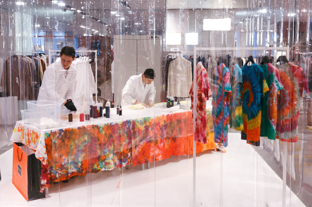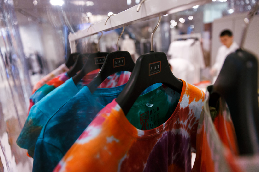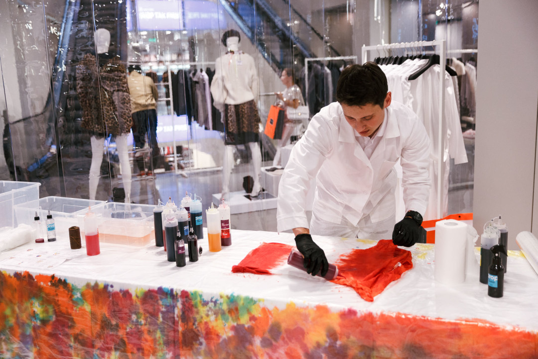 В ДЛТ открылась поп-ап лаборатория, где можно самостоятельно кастомизировать вещи в технике tie-dye («завяжи и покрась»). Она появилась на Западе в конце 1960-х — начале 1970-х благодаря движению хиппи и вернулась в моду в 2019-м — например, в коллекциях R13, Prabal Gurung, Proenza Schouler, Prada и Stella McCartney.