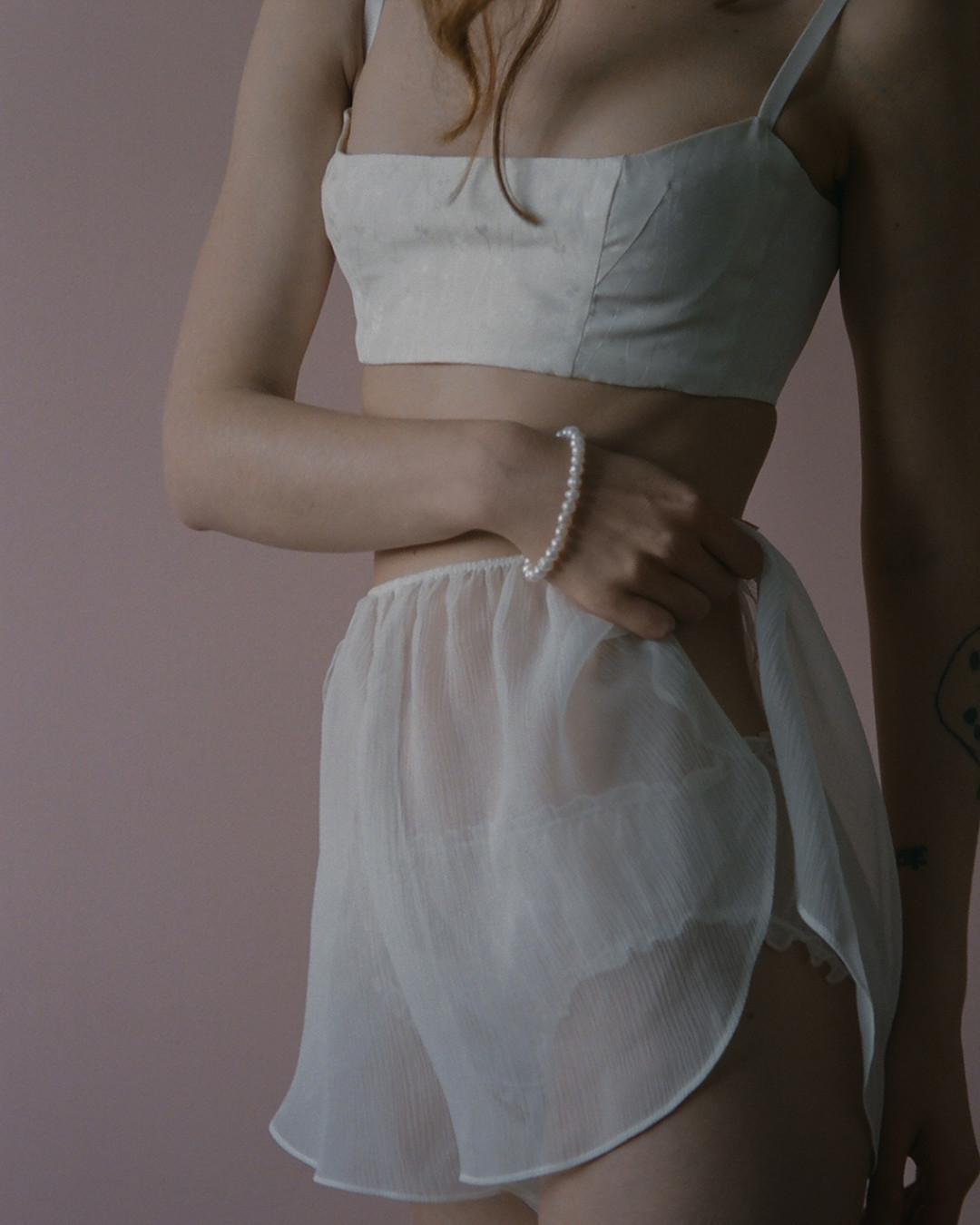 Нижнее белье петербургского бренда уже поступило в продажу в интернет-магазине, а также в студии, расположенной в переулке Пирогова, 18. Хлопковый низ стоит 3900 рублей, шелковые шорты — 5500 рублей, боди на пуговицах — 16 900 рублей, а полупрозрачный халат — 21 000 рублей.