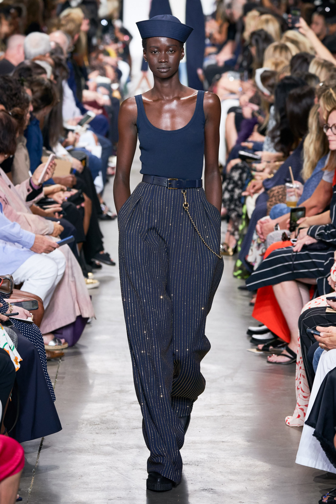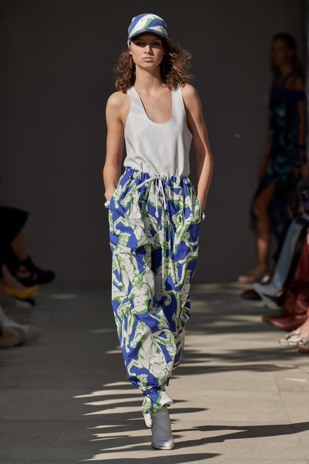 В целом, в следующем сезоне акцент будет сделан не на верхнюю, а на нижнюю часть образа: к золотым плиссированным юбкам, переливающимся полосатым брюкам и шароварам на кулиске с изображением Нептуна дизайнеры подбирают самый простой джемпер или футболку. Одна из таких в народе получила название майка-«алкоголичка» и продается едва ли не в каждом масс-маркете. Берем несколько сразу!