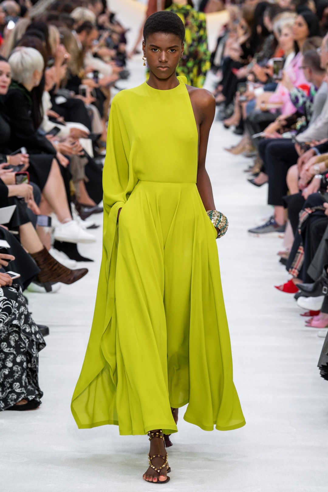После такой отсылки к коллекции Валентино Гаравани 1968 года на подиуме появились утрированно яркие образы в салатовом, розовом и желтом цветах. Это платья с мелкой плиссировкой, туники с глубоким декольте, блузы, превращенные в минималистичные пончо, и наряды с открытыми плечами, которые мы наверняка увидим на красных дорожках в этом и следующем году.